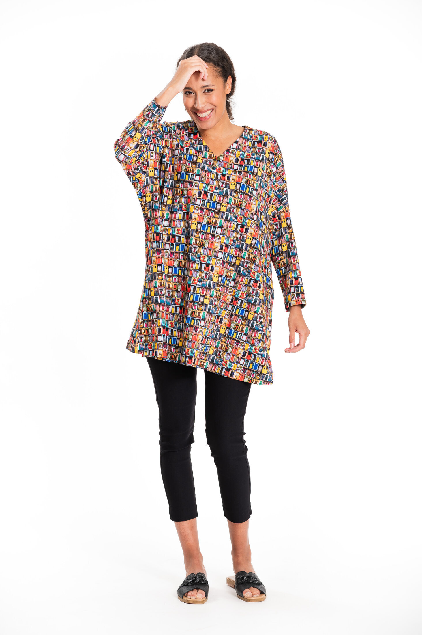 Alexa -tunikassa on erittäin reilu ja rento mitoitus, laskettu olkalinja ja leveät 3/4 mittaiset hihat. V-pääntie. Doors Tricot on miellyttävää, ohutta puuvillatrikoota.