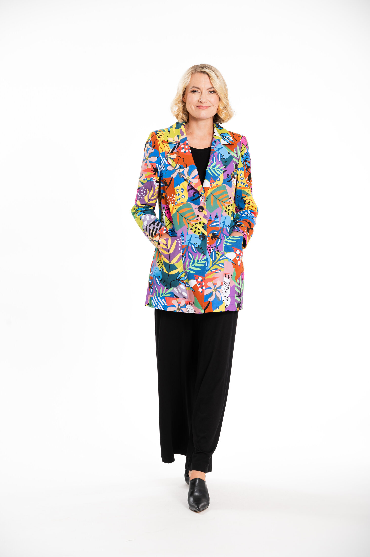 Julia bleiserin hauskuus tulee kontrastista, jossa omaperäinen, hauska, värikäs AINO -kuosi yhdistyy klassiseen, väljälinjaiseen bleiseriin. Materiaali on ohutta puuvillakangasta.