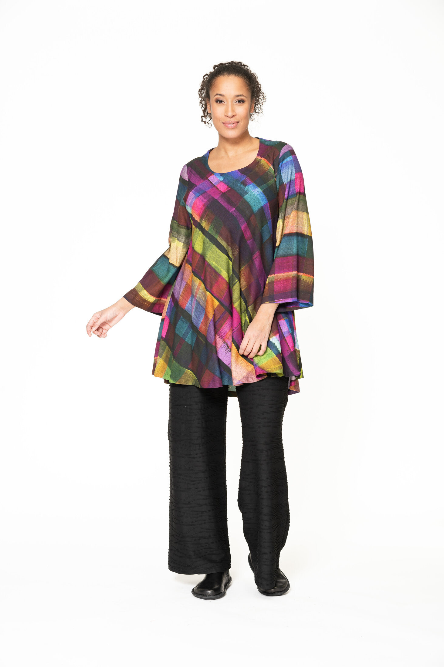 Marve on elegantti tunika, jossa on pyöreä pääntie ja ¾-pituiset hihat. Tunikan etu- ja takakappaleet on leikattu vinoon, joten Marve -tunika istuu upeasti vartalolle kuin vartalolle. Tunika on aavistuksen pidempi takaa. Miru -kuosissa on upeat syksyn värit. Miru on 100 % viskoosia. Sopii hyvin loppukesän lämpimiin päiviin.