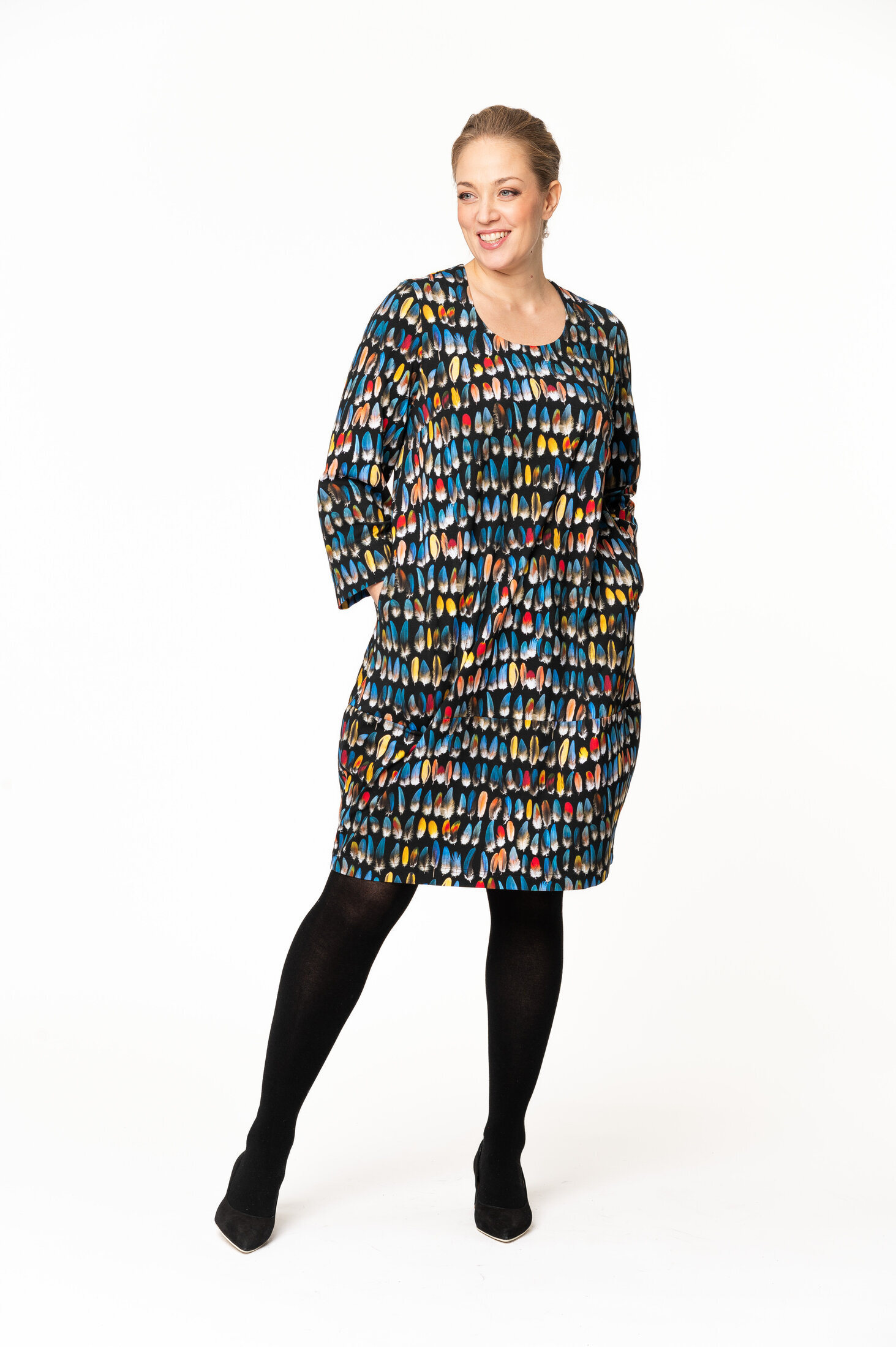 Merette -mekossa on istuva yläosa ja tulppaanimainen helma, jossa on kiinnostava poikkileikkaus. Mekossa on pitkät hihat ja sivutaskut.