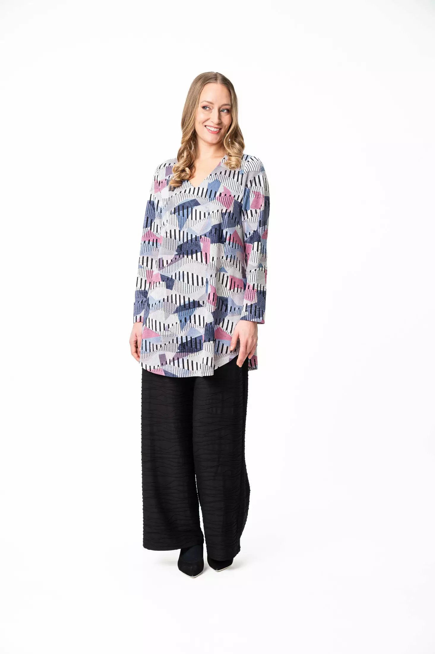aino Pepi -tunika on täydellinen lisä vaatekaappiisi. Siinä on V-kaula-aukko ja pyöristetty helma, ja sen istuvuus on suunniteltu erityisesti rintavammille naisille. Tunika on valmistettu laadukkaasta viskoositrikoosta, joka tuntuu pehmeältä ja joustavalta päällä. Monivärinen Kinos-kuosi tuo asuun ilmettä ja persoonallisuutta.