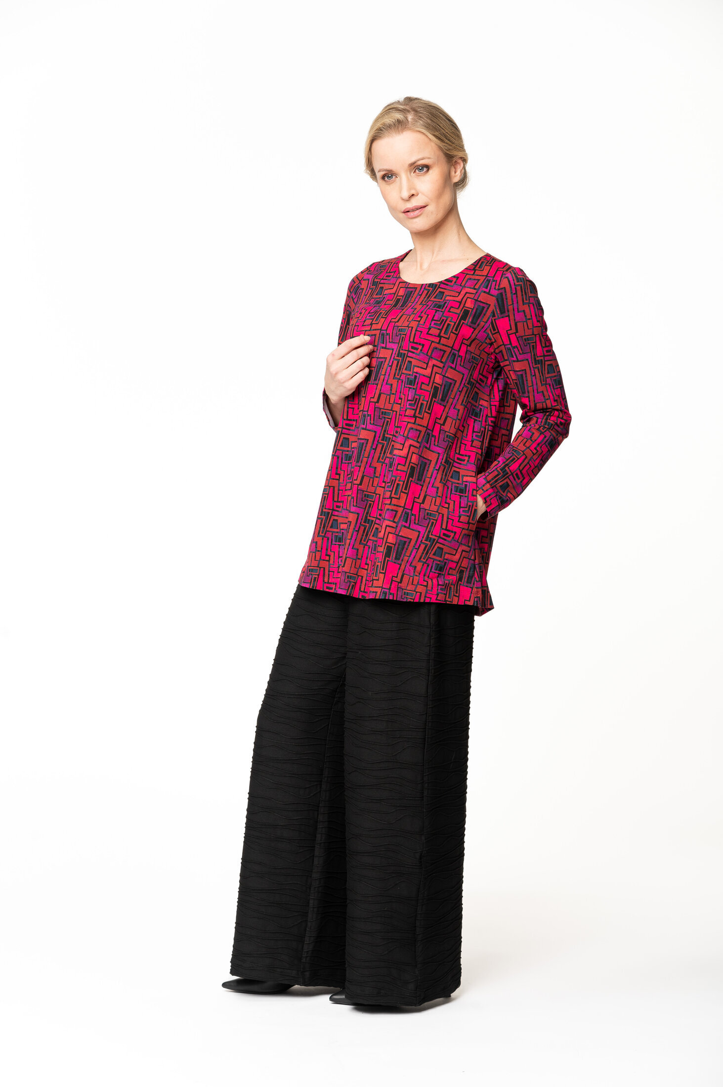Raisa on lyhyt tunika, jossa on normaalimitoitus ja sivusaumataskut. Tunikassa on pitkät hihat ja pyöreä pääntie.