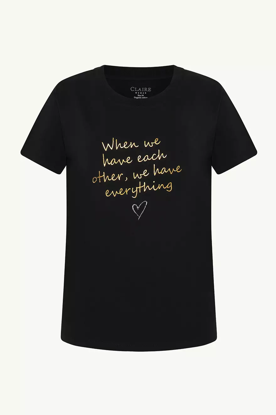 Tuo vaatekaappiisi ripaus positiivisuutta tällä CLAIRE Amina T-paidalla. Pehmeästä, joustavasta luomupuuvillasta valmistettu t-paita on mukava päällä ja sopii täydellisesti osaksi rentoa arkipukeutumista. Paidassa on ribbineulottu pääntie ja etupuolella kultaisella painatuksella teksti "When we have each other, we have everything".