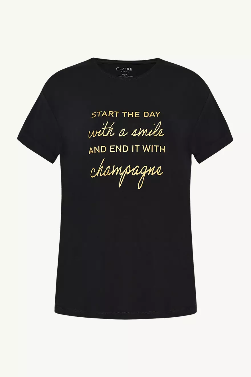 Tämä CLAIRE Aoife -t-paita on valmistettu ihanan pehmeästä jersey-kankaasta. Taitetut hihansuut tuovat paitaan rennon yksityiskohdan. Etupuolta koristaa inspiroiva printti tekstillä "Start the day with a smile and end it with Champagne". Tuote on Öko-Tex 100® -sertifioitu, mikä takaa sen turvallisuuden ja haitta-aineettomuuden.