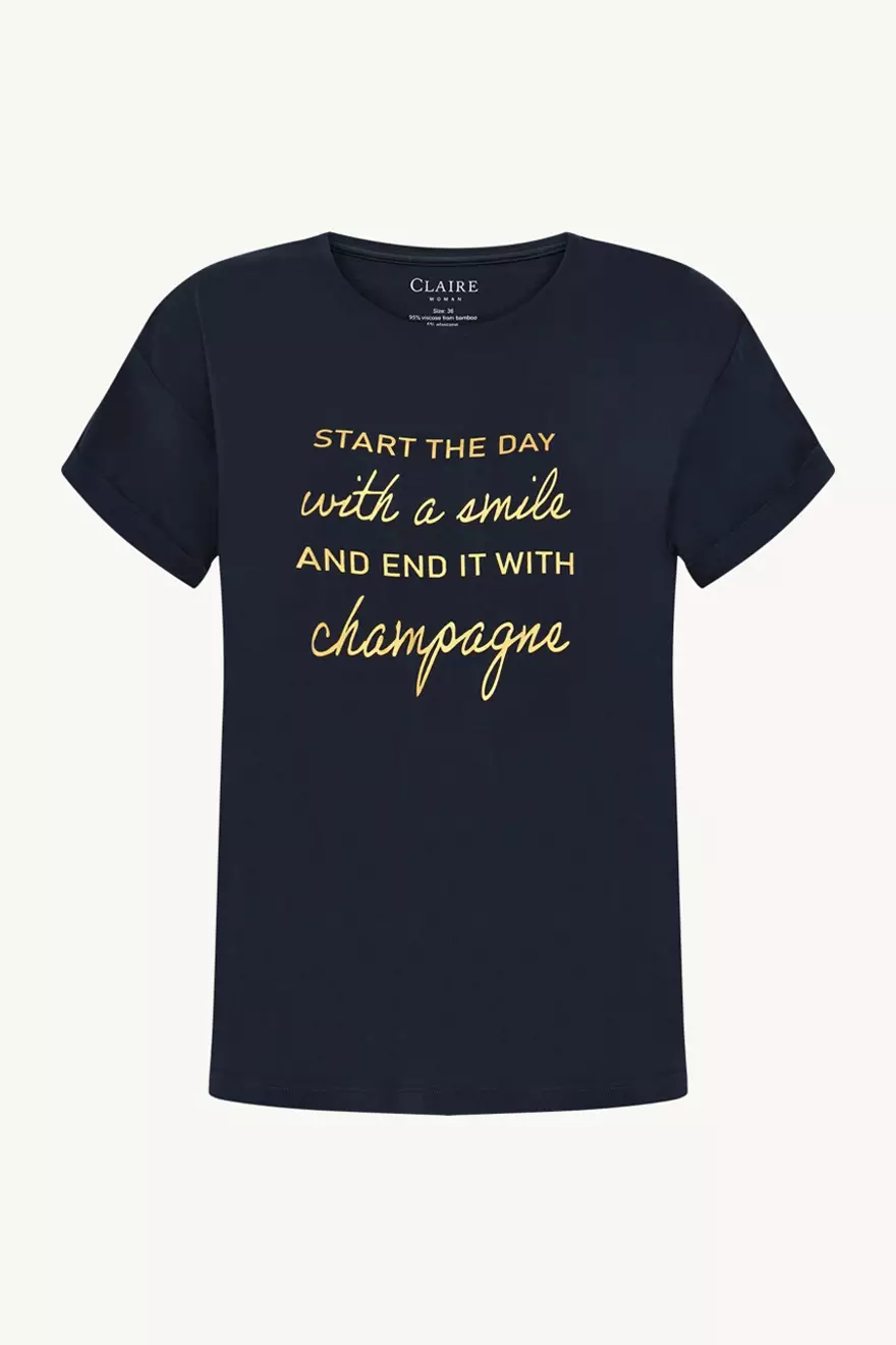 Tämä CLAIRE Aoife -t-paita on valmistettu ihanan pehmeästä jersey-kankaasta. Taitetut hihansuut tuovat paitaan rennon yksityiskohdan. Etupuolta koristaa inspiroiva printti tekstillä "Start the day with a smile and end it with Champagne". Tuote on Öko-Tex 100® -sertifioitu, mikä takaa sen turvallisuuden ja haitta-aineettomuuden.
