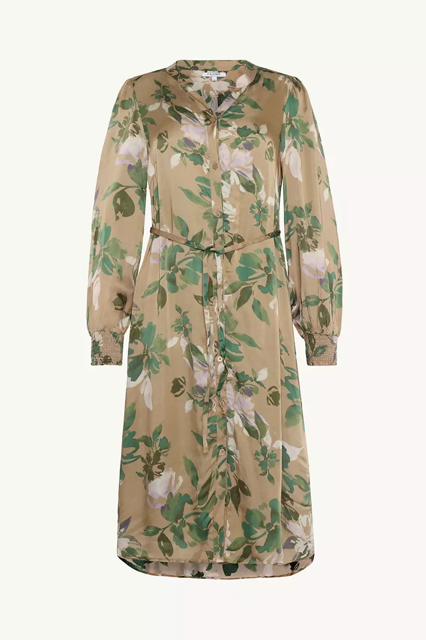 Design: Pitkähihainen paitamekko. V-pääntie, kukkakuvio, laskokset olkapäillä, joustava smokkirypytys hihoissa, nappikiinnitys edessä, irrotettava vyö.