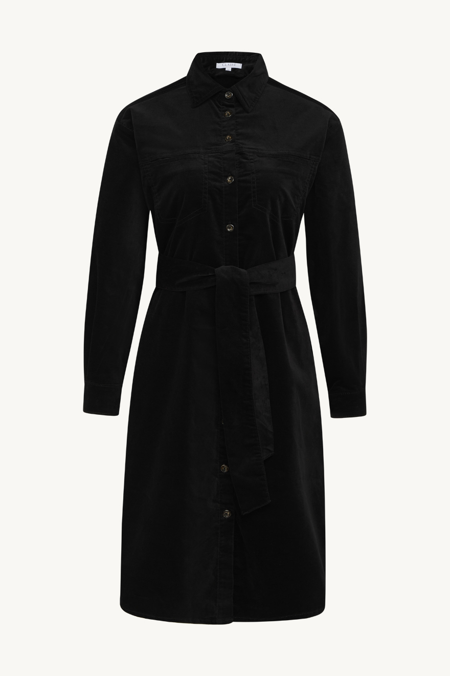Pitkä farkkumekko, jossa rintataskut ja sivusaumataskut, valmistettu pehmeästä ja joustavasta materiaalista. Mekossa on edessä napitus, helman sivuilla halkiot ja vyötäröllä irrallinen sidottava vyö.