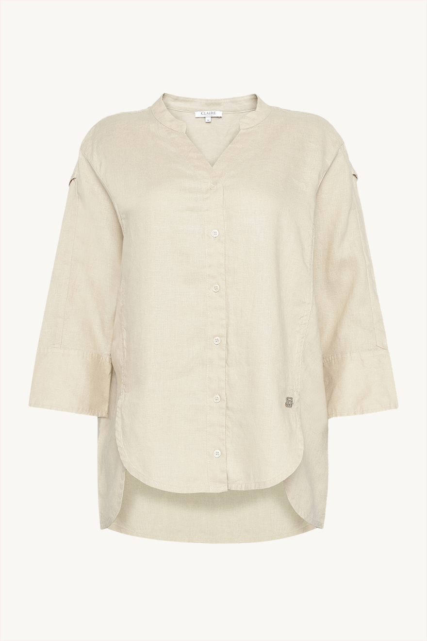 Clairen kudottu pellavapaita, jossa on pienet pystykaulukset, V-pääntie ja nappikiinnitys edessä. Vaatteessa on sivuilla halkiot, ja siinä on kaareva helma, joka on pidempi takana sekä 3/4-pituiset hihat.