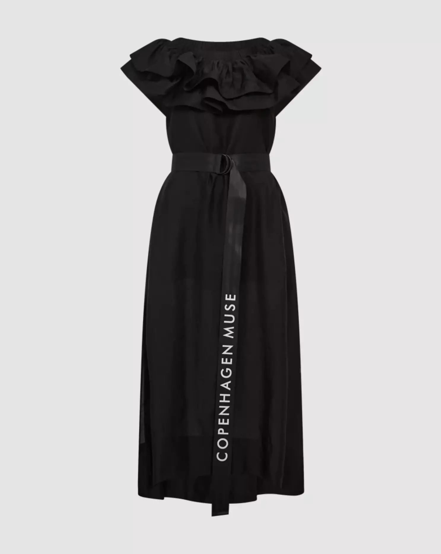 COPENHAGEN MUSE Molly -mekko on pitkä ja elegantti olkapäät paljastava luomus, joka on valmistettu laadukkaasta, kauniisti laskeutuvasta premium-materiaalista. Mekossa on edessä trendikäs lyhyempi helma ja korkea sivuhalkio, jotka tuovat asuun leikkisyyttä ja liikettä. Käytännölliset sivutaskut, vyötäröllä logoyksityiskohdalla varustettu vyö sekä näyttävät volangit (ruffles) jäykisteillä, jotka pitävät upean muotonsa, tekevät tästä mekosta todella ainutlaatuisen.