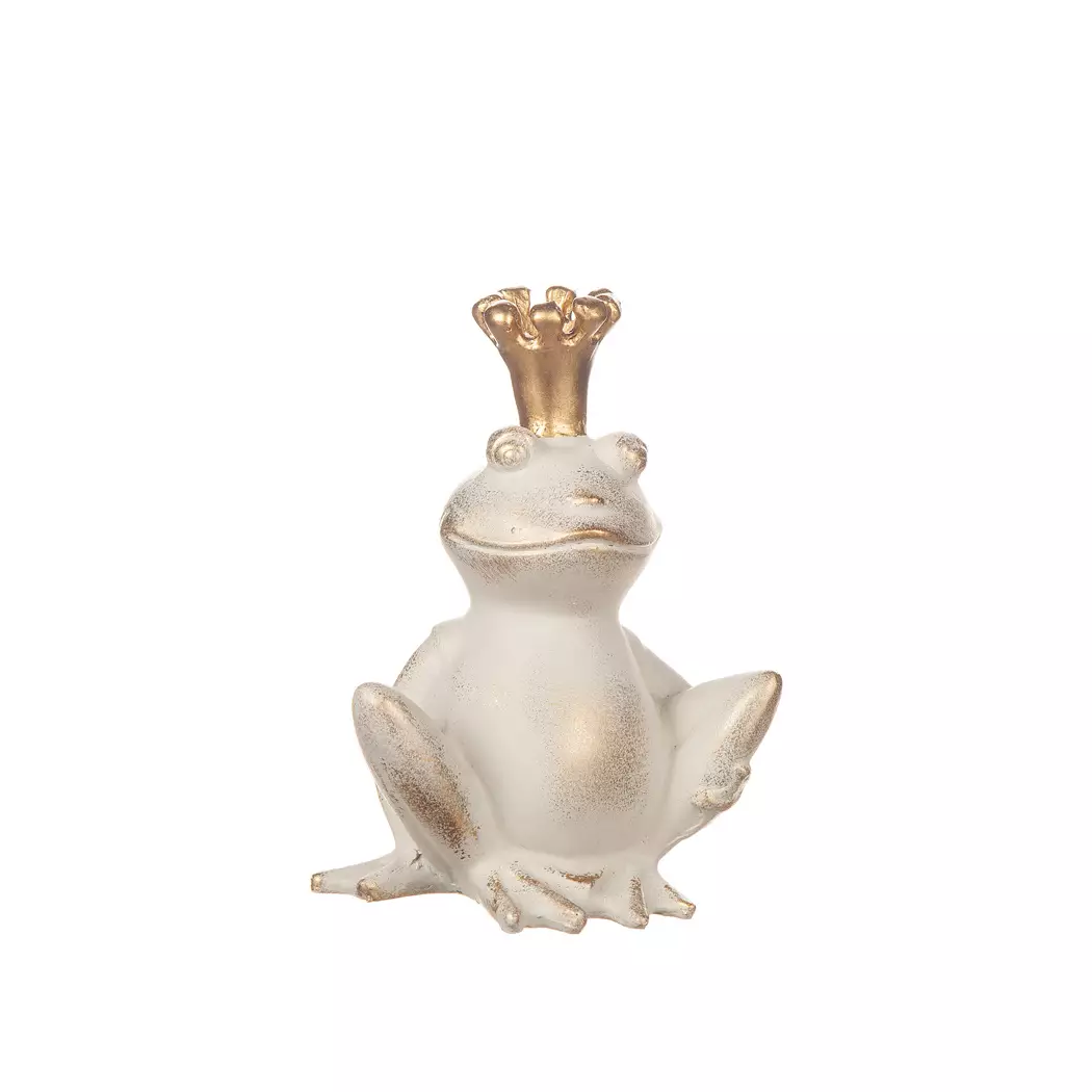 Tämä valkoinen ja kultainen, polymuovista valmistettu joogaava sammakko kruunulla on hauska ja persoonallinen lisä sisustukseesi. Sen leikkisä muotoilu ja kuninkaallinen kruunu tuovat kotiisi iloa ja huumoria.
