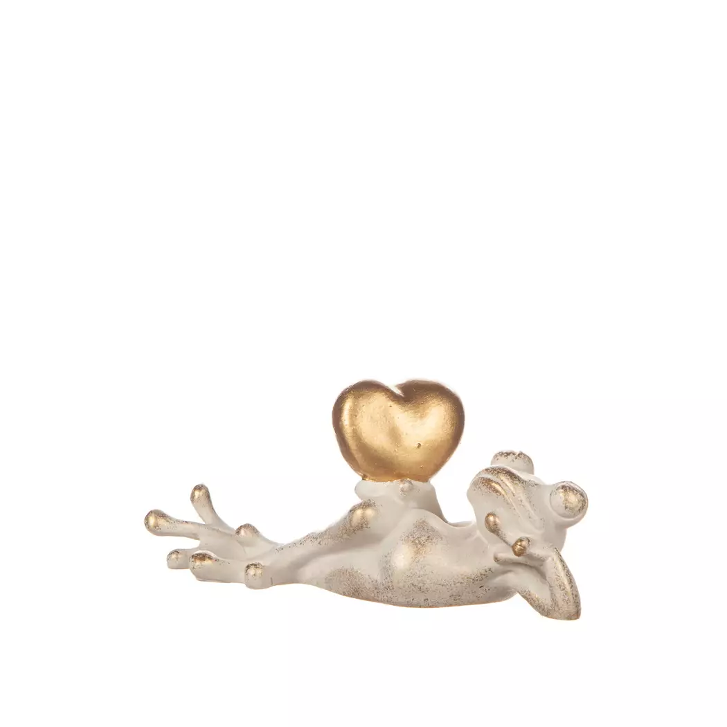 Tämä valkoinen ja kultainen, polymuovista valmistettu makaava sammakko, joka pitelee sydäntä, on rentouttava ja romanttinen lisä sisustukseesi. Sen leppoisa asento ja kultainen sydän tuovat kotiisi lämpöä ja rakkautta.