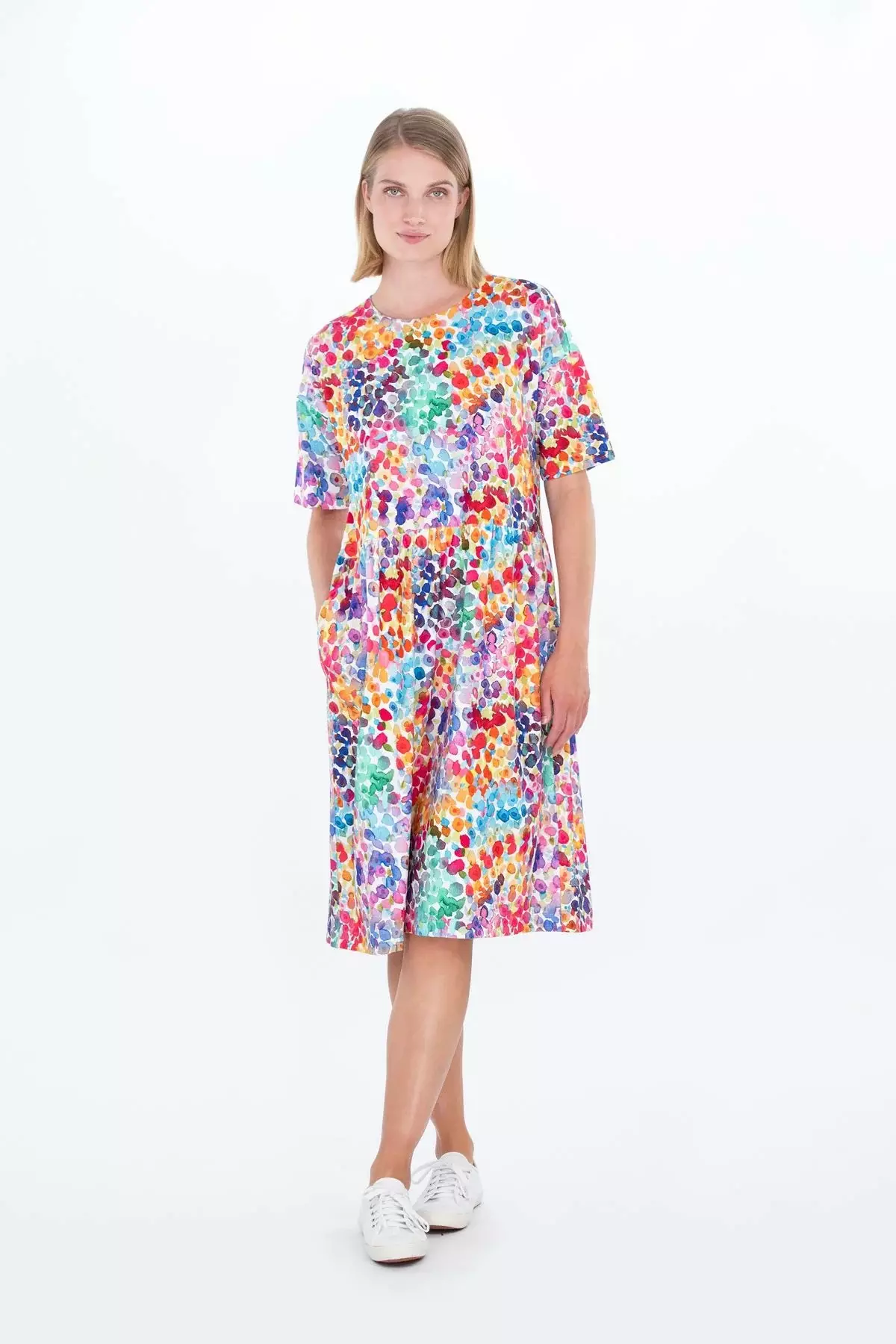 - Kesäinen kukkakuosi: LEHDOKKI-mekon kuosissa kukkivat värikkäät kukat, jotka tuovat mieleen lämpimät kesäpäivät.