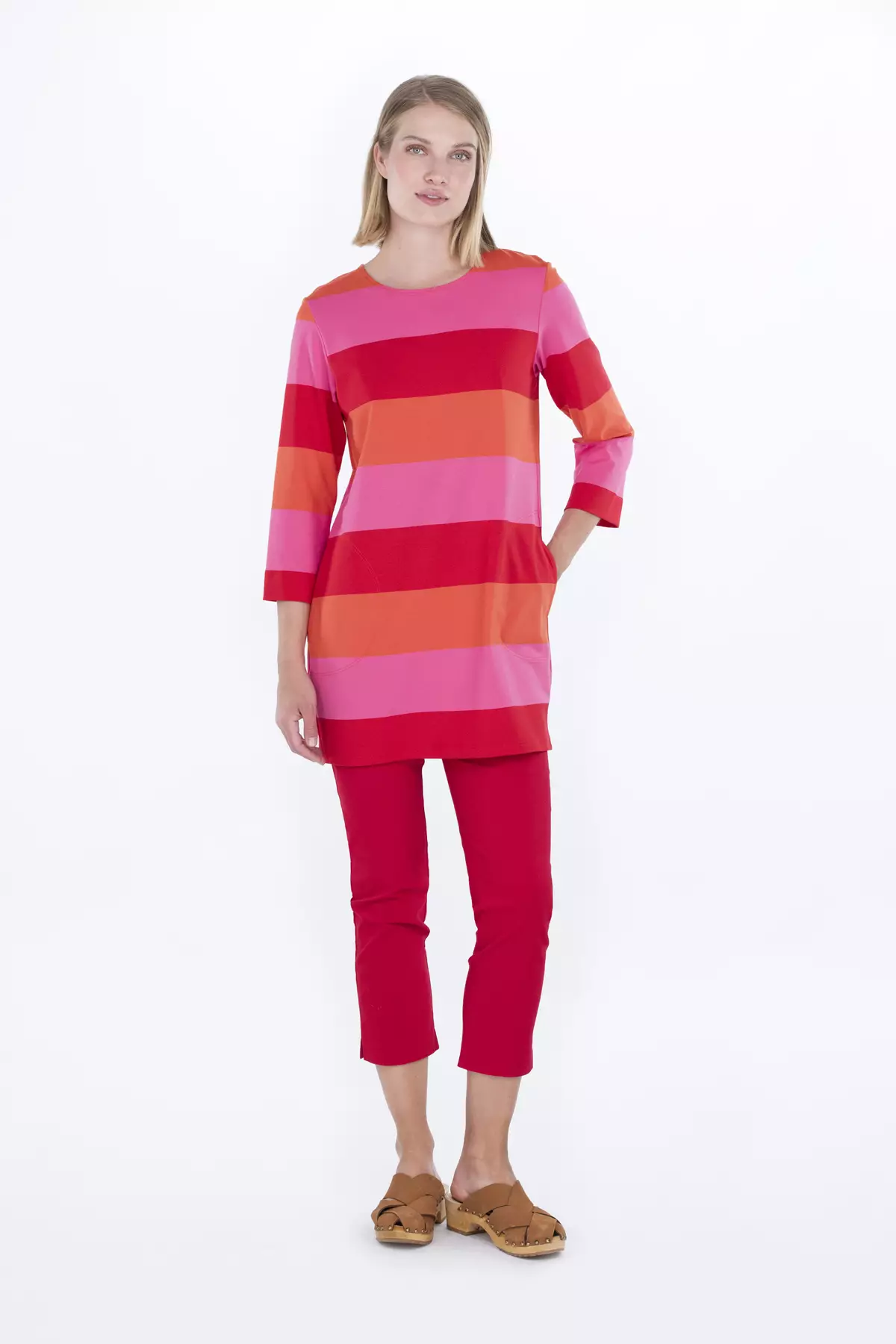 - Raikas raidallinen kuosi: SIRRI-tunikan kuosissa on punaisia, pinkkejä ja oransseja raitoja, jotka tuovat mieleen lämpimät kesäpäivät.