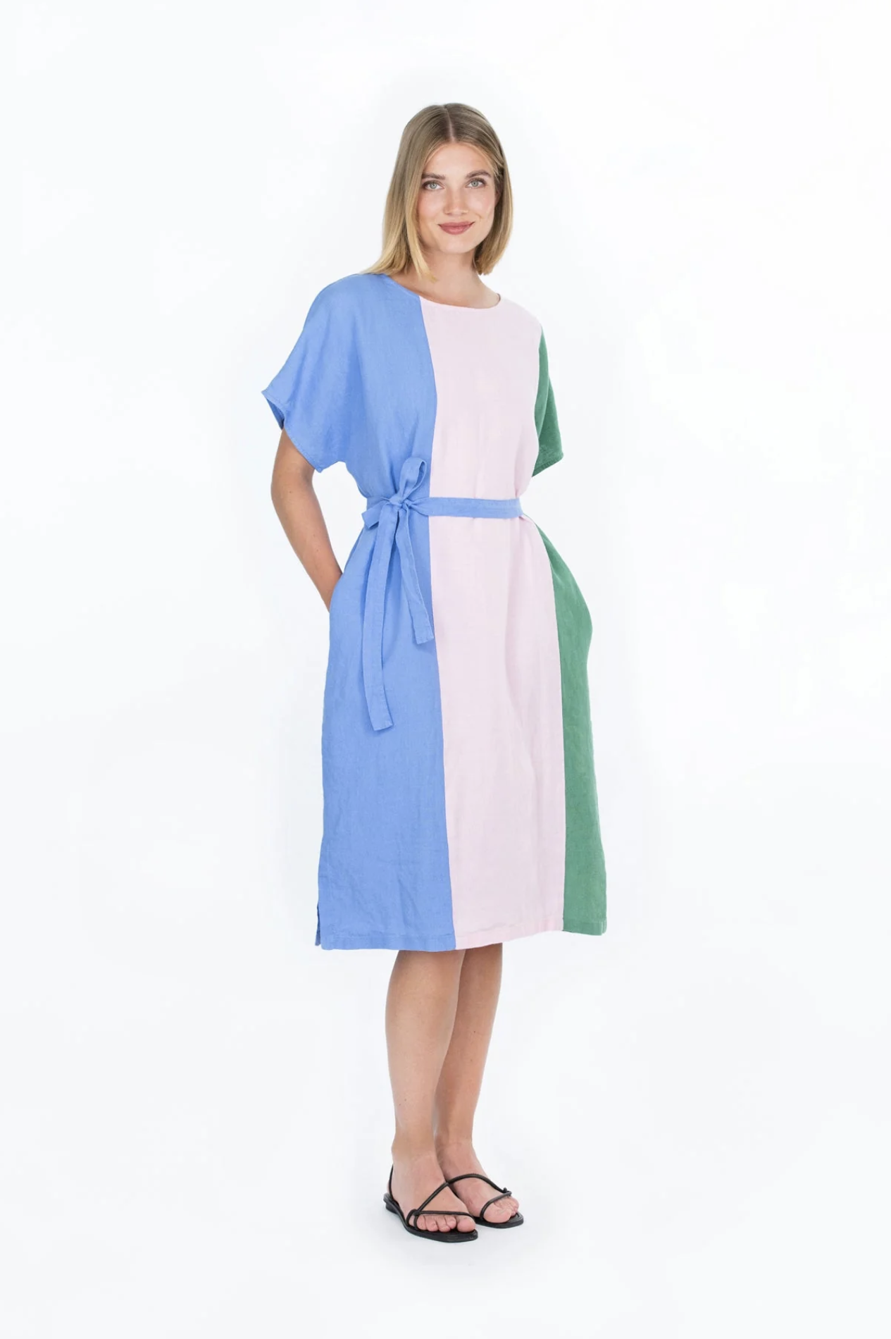 Monivärinen Taivas-mekko on malliltaan väljä ja suoralinjainen. Kesäisen mekon leveiden pystyraitojen väreinä on sininen, vaaleanpunainen ja vihreä. Vaatteessa on pyöreä pääntie ja lyhyet holkkihihat. Taskullisen Taivas-mekon helmassa on halkiot, ja siihen kuuluu irtovyö. Laadukkaasta ja kauniisti laskeutuvasta pellavasta valmistettu mekko on tuotepesty, joten se ei kutistu, ja se tuntuu miellyttävän pehmeältä päällä.