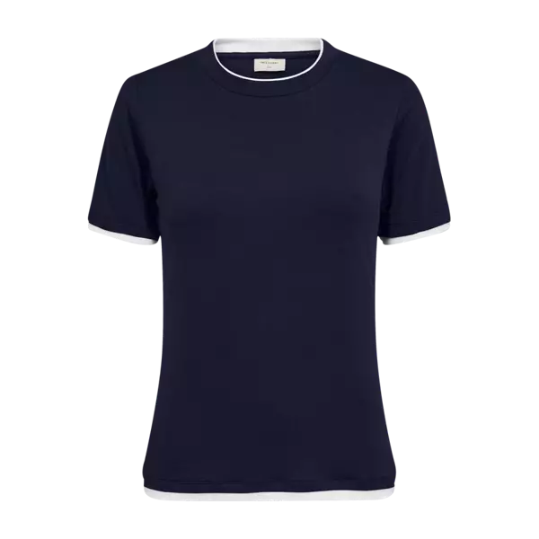Materiaali koostuu korkealaatuisesta viskoosista ja elastaanista, mikä tekee paidasta silkkisen pehmeän ja joustavan. Se tuntuu viileältä iholla ja laskeutuu upeasti, säilyttäen muotonsa erinomaisesti. Tummansinisen ja luonnonvalkoisen klassinen väriyhdistelmä on ajaton ja tuo mieleen raikkaan merellisen tyylin.