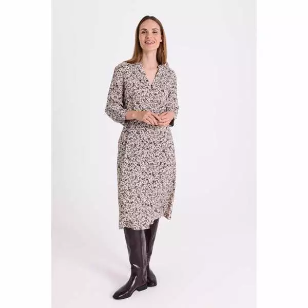 FREE/QUENT FQMOLLI on henkäyksen kevyt ja hurmaava viskoosimekko, joka yhdistää romanttisen kukkakuosin ja modernin mukavuuden. Mekon hienostunut pohjasävy on hiekanvaalea (Moonbeam), jota koristaa tyylikäs musta kukkameri. Tämä mekko on suunniteltu korostamaan naisellisuutta hienovaraisesti: V-pääntie, vyötärön kauniit laskokset ja ilmavat pallohihat luovat yhdessä elegantin kokonaisuuden, joka sopii niin arkeen kuin juhlaankin.