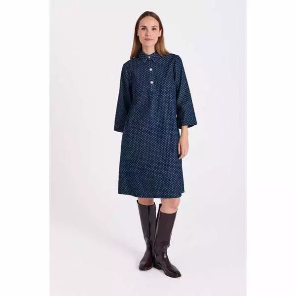 Yksityiskohtainen kuosi: Syvän tummansiniseen denim-pohjaan on yhdistetty tyylikäs allover-printti, joka tuo mekolle uniikin ja mielenkiintoisen ilmeen ilman, että kokonaisuus on liian levoton.