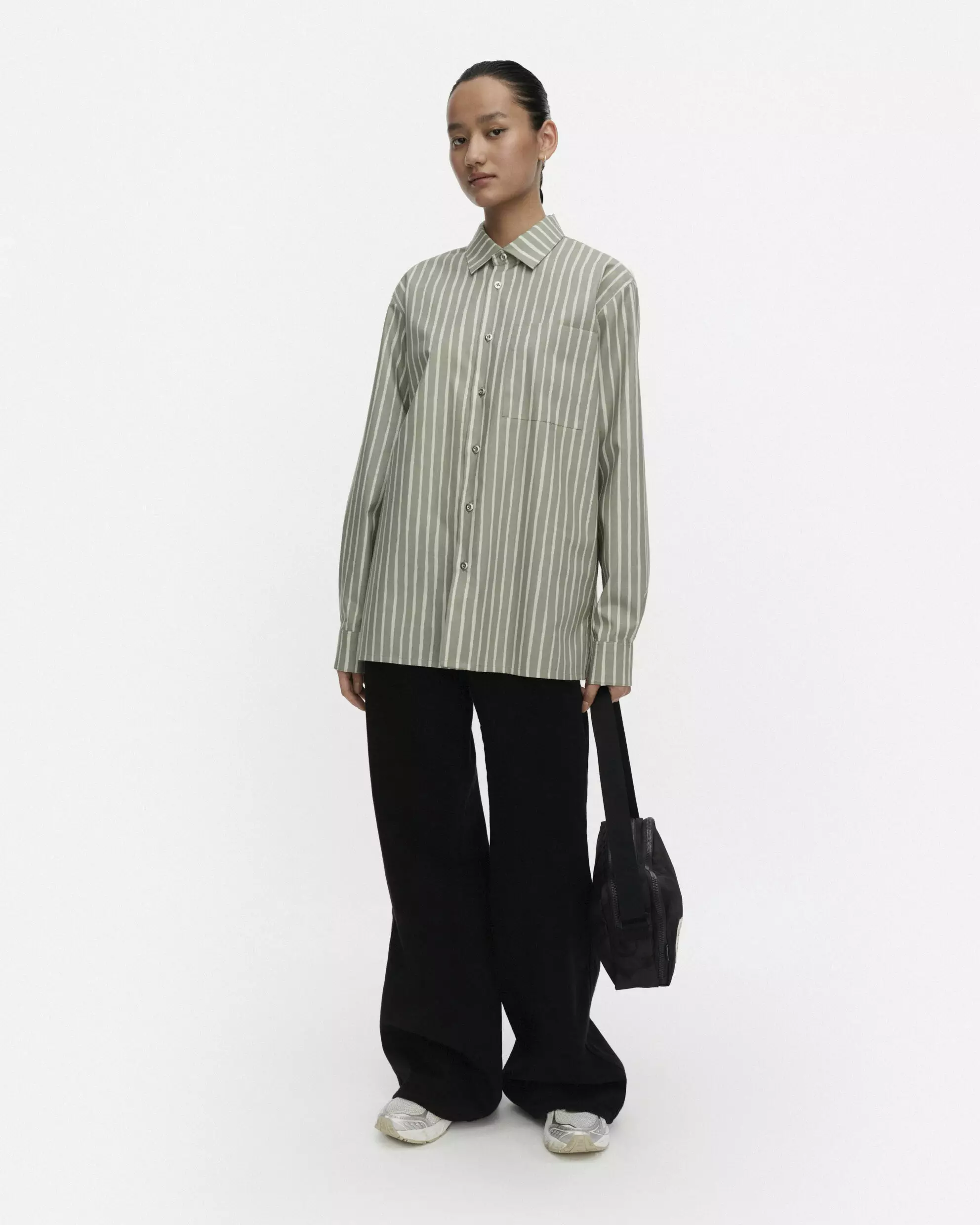 Yksityiskohdat: Kaulukset, metallinappisuljenta, rintatasku sekä halkiot ja mansetit metallinapeilla hihansuissa. Sivusaumojen pienet helmahalkiot lisäävät rentoutta.