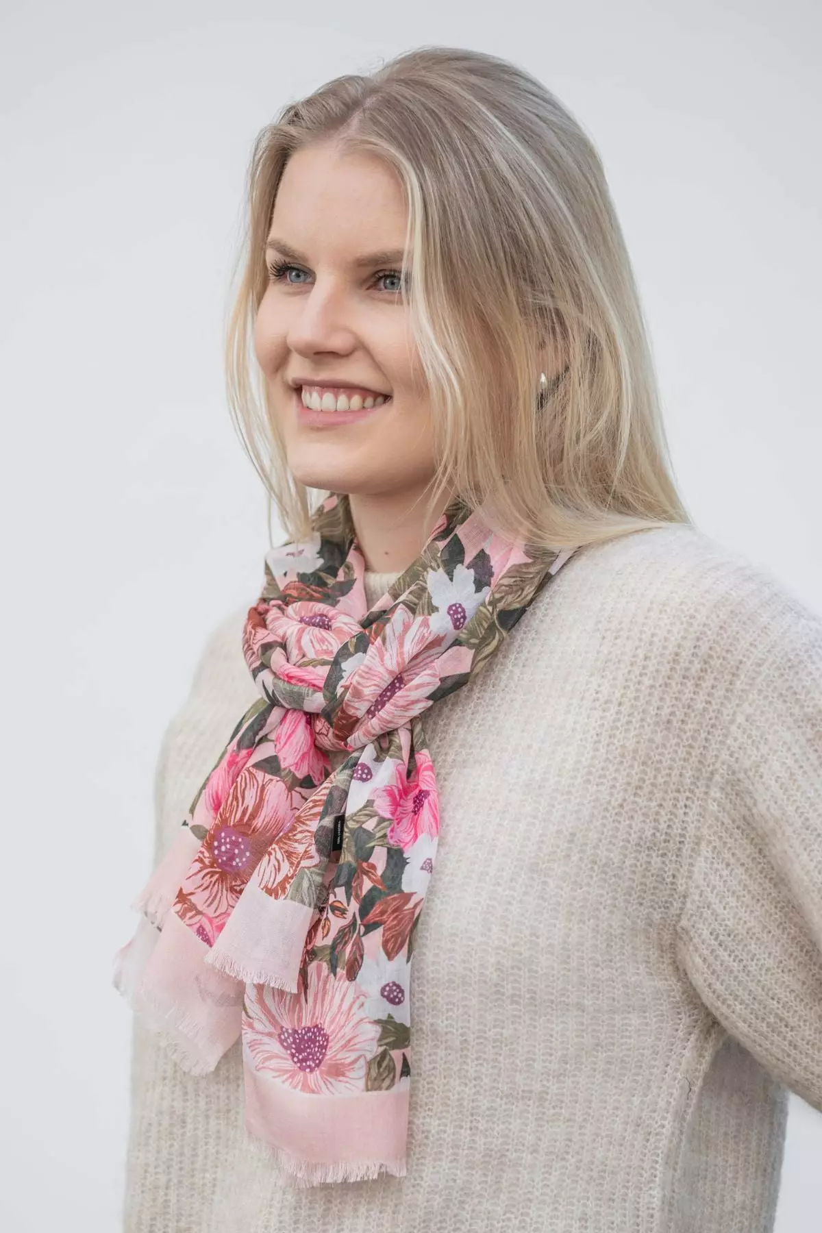 Lene-huivi on täydellinen valinta vastuullista muotia ja ajatonta kauneutta arvostavalle. Roosa kukkakuviointi on suunniteltu näyttämään hyvältä erityisesti yksiväristen asujen kanssa, tuoden kokonaisuuteen ripauksen romanttista eleganssia. Lyocell-kuitu tekee huivista paitsi kauniin, myös teknisesti erinomaisen: se on luonnostaan antibakteerinen, hengittävä ja rypistyy huomattavasti vähemmän kuin perinteinen puuvilla.