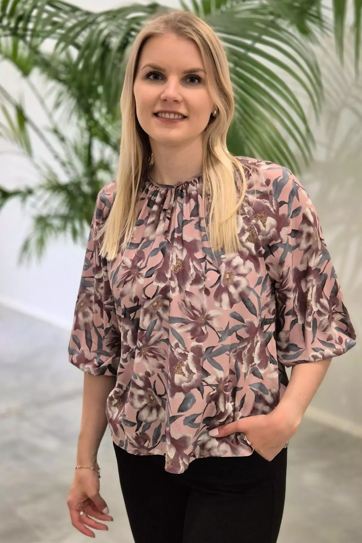 Huoliteltu juhlalook: Pue pusero siistin harmaan tai tummansinisen kynähameen pariksi. Kukkakuosi ja puolipitkät hihat tuovat asuun juhlavuutta.