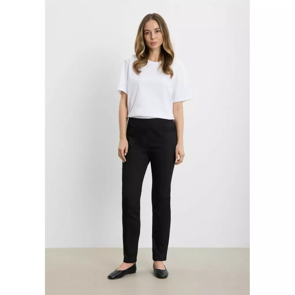 Nämä LAURIE Slender Rouge Regular -housut ovat innovatiivinen malli, joka on suunniteltu erityisesti naisille, joilla on kapeat lonkat, pienempi takapuoli, hieman vatsaa ja hoikat jalat. Housuissa on normaali istuvuus, joustava vyötärö ja lyhyt lahkeen pituus (75-77 cm). Ne on valmistettu korkealaatuisesta luomupuuvillasekoitteesta (63 % luomupuuvillaa, 34 % polyesteriä, 3 % elastaania), joka tuntuu miellyttävältä päällä ja antaa runsaasti joustavuutta. Musta väri tekee niistä monikäyttöiset ja helposti yhdisteltävät.