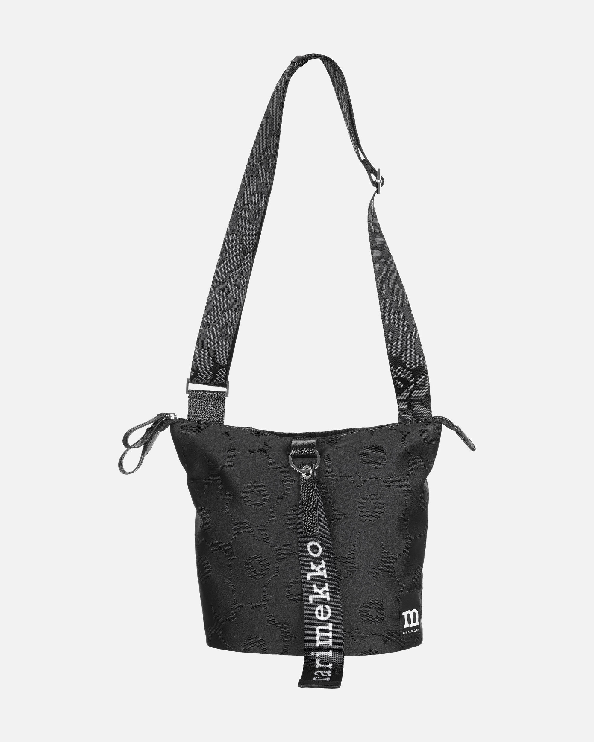 Unikko-kuosinen Carry All -olkalaukku on valmistettu kierrätetystä, jacquard-kudotusta polyesterista. Laukku sulkeutuu vetoketjulla ja siinä on kantokahva sekä säädettävä, kierrätetystä polyamidista valmistettu olkahihna, jossa on jacquard-kudottu Unikko-kuosi. Laukussa on yksi sisätasku sekä yksi avoin ulkotasku, jossa on magneettinappisuljenta. Etupuolelle on kiinnitetty Marimekko-avaimenperä. Laukussa on nahkaisia yksityiskohtia.