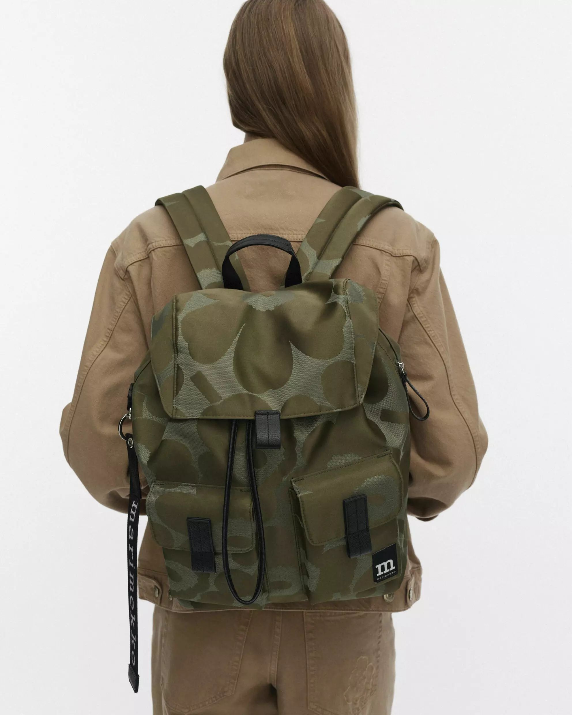 Vihreä-vaaleanvihreä-sävyisessä repussa on lisäksi pitkä vetoketjutasku sivulla ja Marimekko-avaimenperä toisella sivulla.