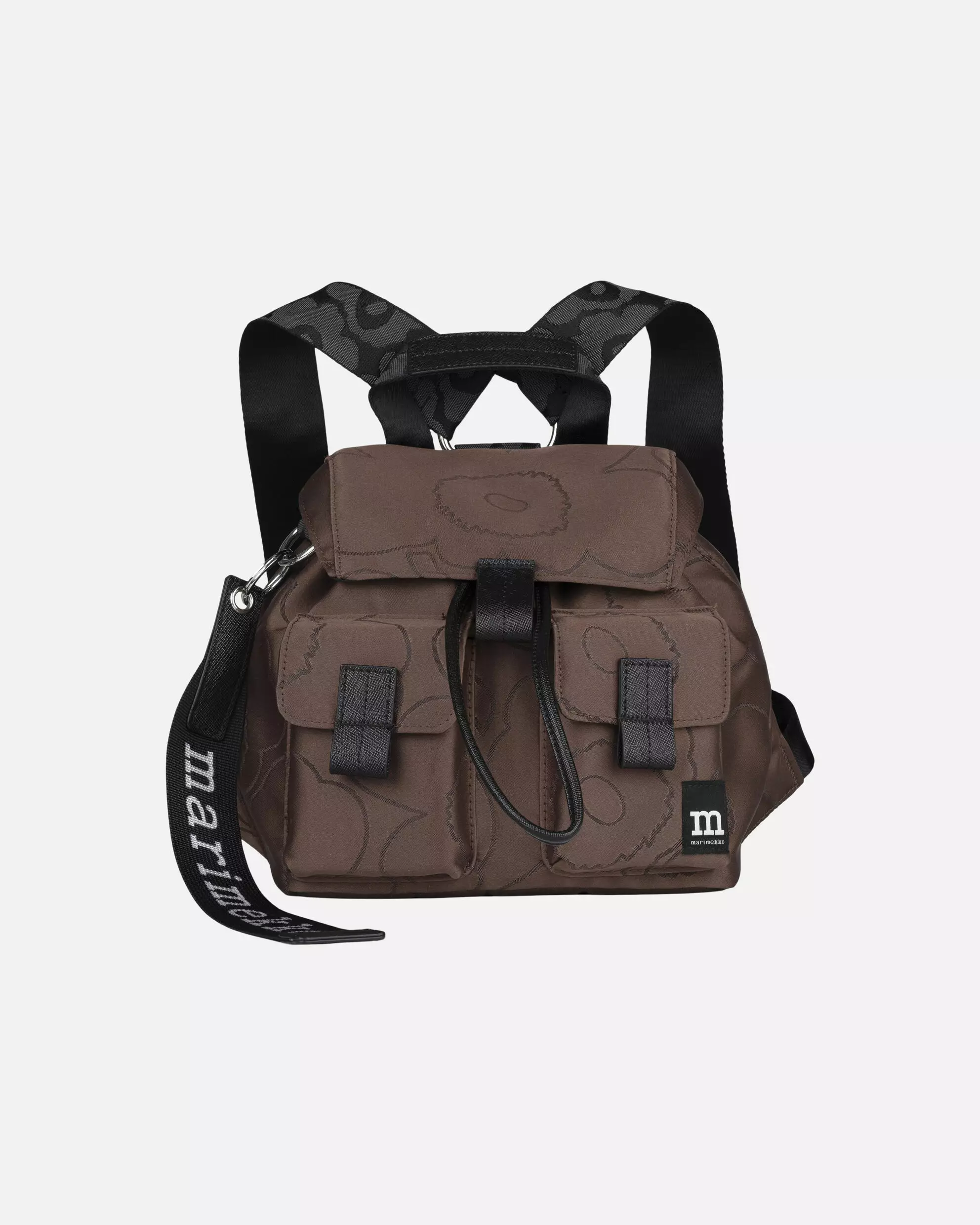 Repun suuaukko suljetaan kiristysnyörillä, jota suojaa magneettinapilla kiinnittyvä kansiläppä. Edessä on kaksi kätevää magneettinapeilla suljettavaa taskua, ja selkäpuolella avoin tasku, joka on täydellinen helposti saataville tarvittaville tavaroille. Olkahihnat ovat säädettävät ja valmistettu kierrätetystä polyamidista. Hihnojen jacquard-kudottu Unikko-kuosi tuo lisää visuaalista kiinnostavuutta. Repun toisella sivulla on Marimekko-avaimenperä, joka on tyylikäs ja käytännöllinen lisä.