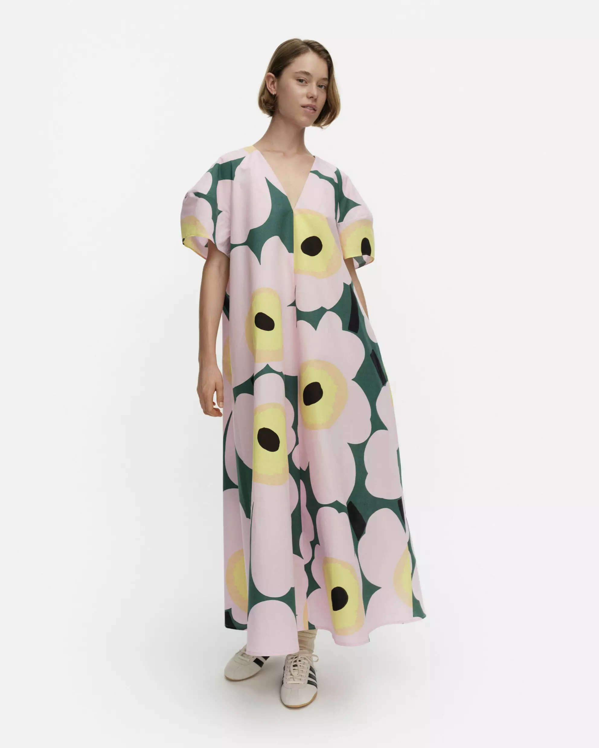 Marimekko Kaffet on moderni ja näyttävä A-linjainen mekon tulkinta, jossa yhdistyvät rento istuvuus ja harkitut yksityiskohdat. Tässä mallissa Maija Isolan ikoninen Unikko-kuosi hehkuu raikkaissa vihreän, vaaleanpunaisen ja keltaisen sävyissä (väri 631). Mekko on suunniteltu mukavuutta ja vahvaa tyyliä arvostavalle – se on yhtä aikaa veistoksellinen ja ilmava.