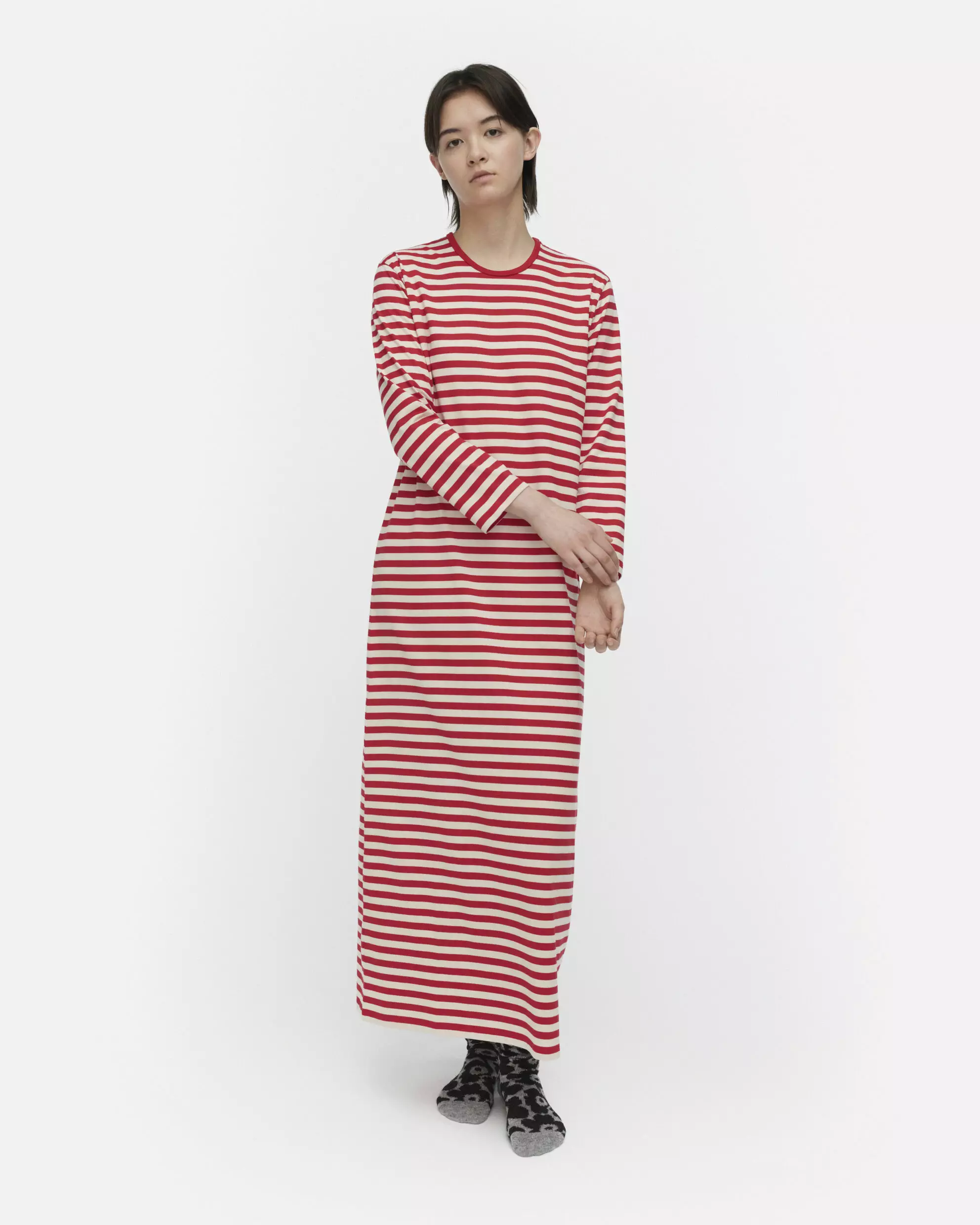 Tämä Marimekon Katju-yömekko on täydellinen valinta rentouttaviin kotihetkiin. Mekossa on Annika Rimalan suunnittelema ajaton Tasaraita-kuosi. Se on valmistettu pehmeästä luomupuuvillasta, ja sen rento, suora leikkaus tekee siitä erittäin mukavan päällä. Mekon täyspitkä helma on hieman levenevä nilkan yläpuolelle.