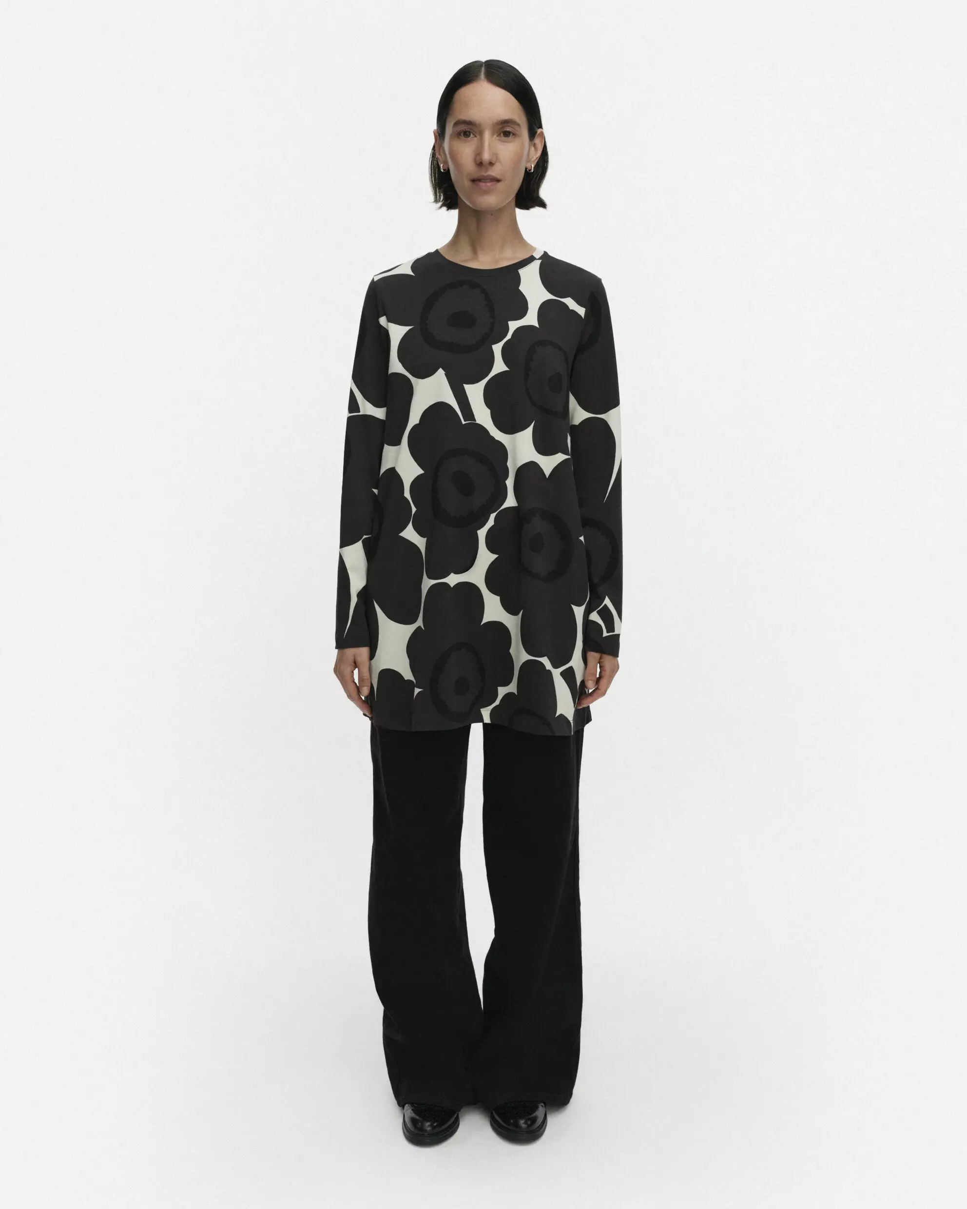 Tämä ihastuttava Marimekko Kevät-tunika on täydellinen asu, joka tuo iloa ja mukavuutta arkeen. Tunika on valmistettu pehmeästä luomupuuvillatrikoosta, jossa on Maija Isolan ikoninen Unikko-kuosi luonnonvalkoisen, tummanharmaan ja mustan sävyissä. Tunikaa koristaa niukka yläosa ja kauniisti laskeutuva A-linjainen leikkaus. Tunikassa on omalla kankaalla viimeistelty pyöreä pääntie ja pitkät hihat.