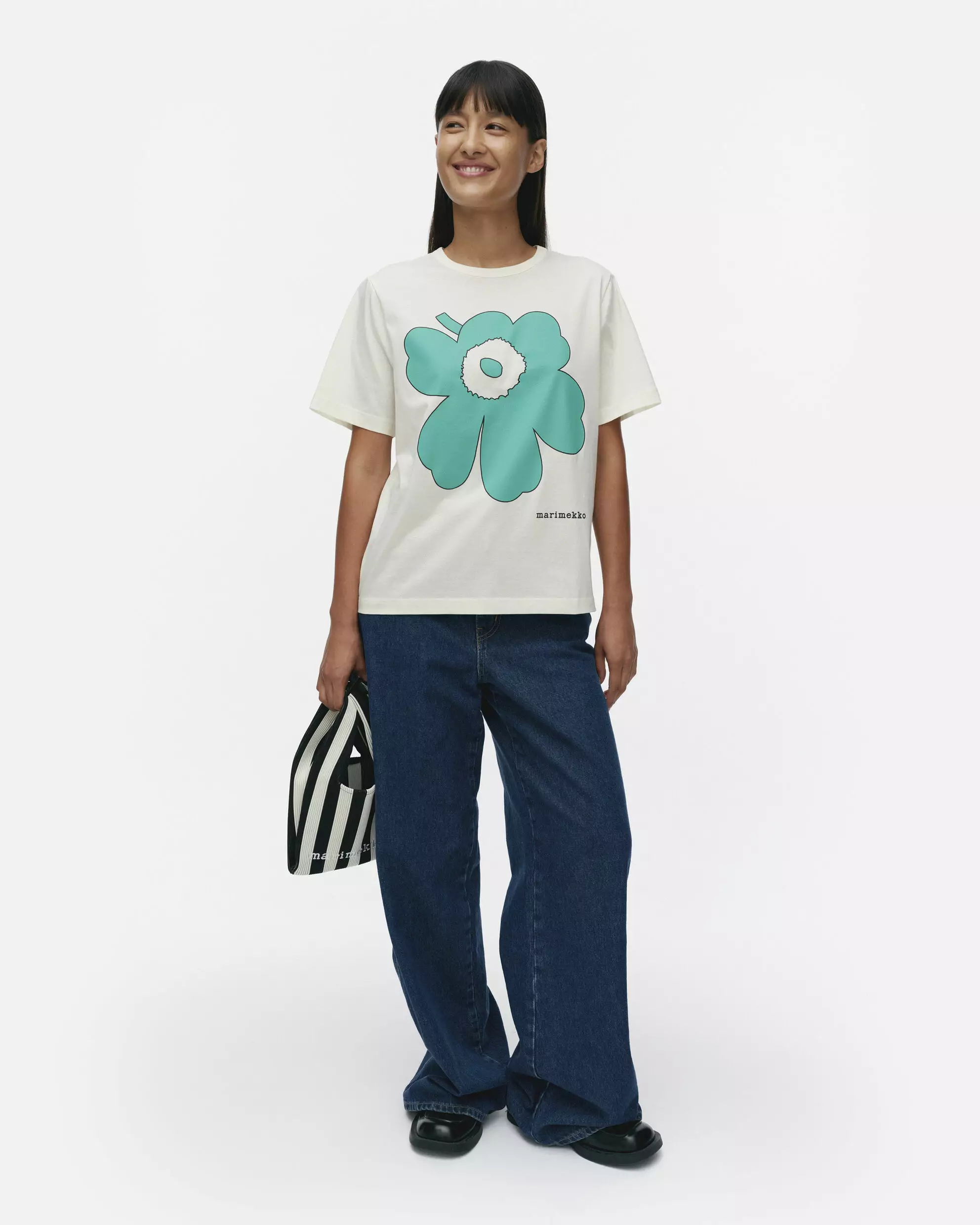 - Uniikki printti: Kappalepainettu Piirto Unikko -kukka ja Marimekko-logo tuovat t-paitaan persoonallisuutta.