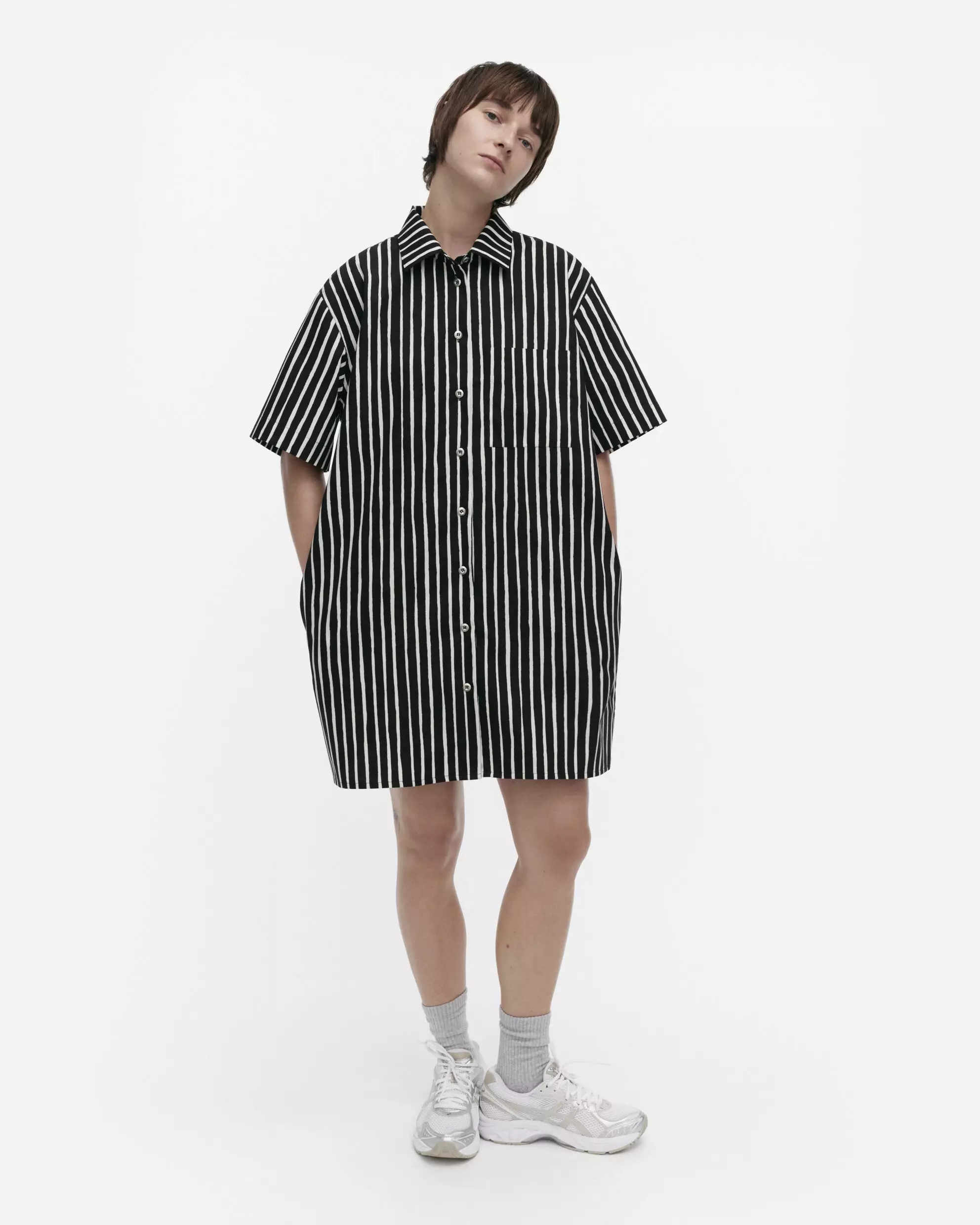 Hanki palanen suomalaista design-historiaa Marimekon Kioski Jokamekko -paitamekolla! Tämä rento ja suoralinjainen mekko on valmistettu 100 % pehmeästä luomupuuvillasta. Sitä koristaa Vuokko Eskolin-Nurmesniemen vuonna 1953 luoma ikoninen Piccolo-raitakuosi, joka on painettu Marimekon omassa painossa Helsingissä. Lyhythihaisessa mekossa on klassiset kaulukset, tyylikäs metallinappisuljenta edessä ja käytännöllinen rintatasku. Mukavuutta lisäävät sivusaumataskut. Mekko on rennolla istuvuudellaan ja suoralla leikkauksellaan Jokapoika-paidan perillinen – alun perin farkkujen rinnalle kaikille farkkuihmisille ikään, kokoon ja sukupuoleen katsomatta luotu, yhä ajankohtainen tasa-arvoa julistava klassikko mustavalkoisena. Jokainen mekko on ainutlaatuinen, sillä ne on ommeltu koko kankaan leveydeltä.