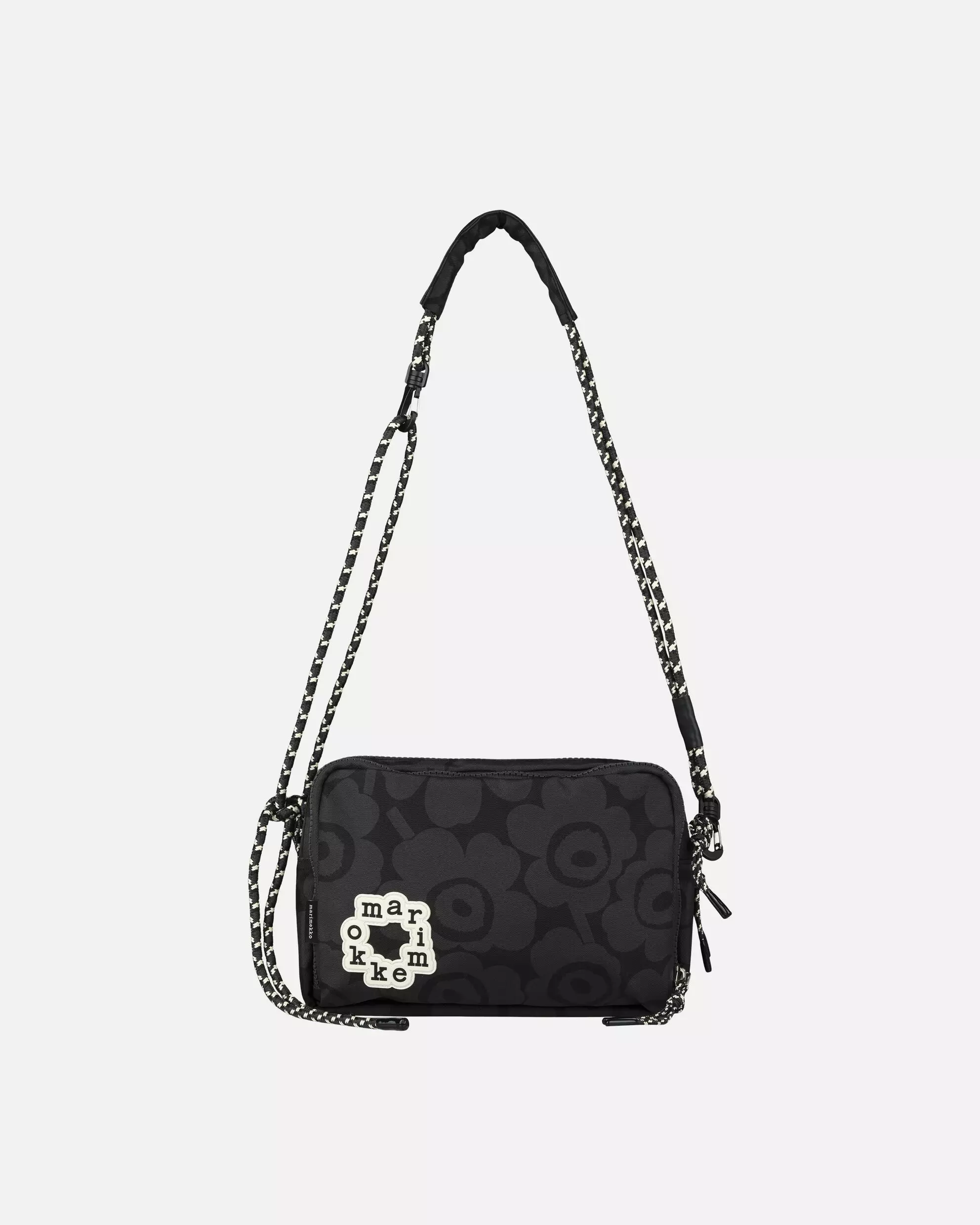 Tuote: Marimekko Kioski Kavari Mini Unikko Olkalaukku Avainsanat: Marimekko Kavari, Mini Unikko, Olkalaukku, kierrätetty polyesteri, tummanharmaa musta, Maija Isola, crossbody, kolme osastoa.