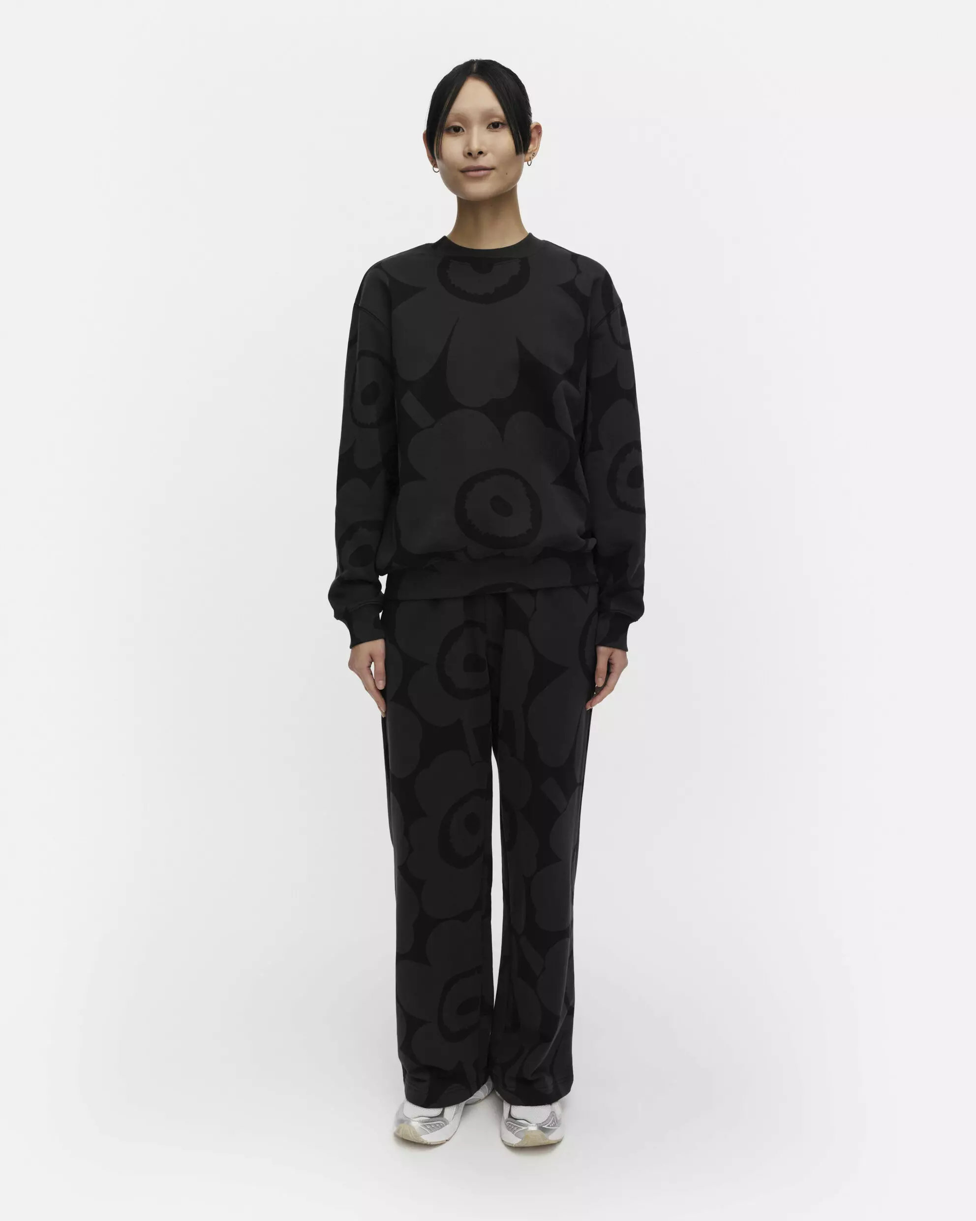 Tämä mukava Marimekko Leiot-collegepaita on täydellinen lisä asuusi, kun etsit rentoutta ja ikonista designia. Paita on valmistettu pehmeästä puuvillacollegesta, jonka puuvilla on luomupuuvillaa. Paidassa on Maija Isolan legendaarinen Unikko-kuosi mustan ja harmaan sävyissä. Rento istuvuus, resorikantilla huoliteltu pyöreä pääntie sekä leveät resorit hihansuissa ja helmassa luovat miellyttävän ja modernin ilmeen.