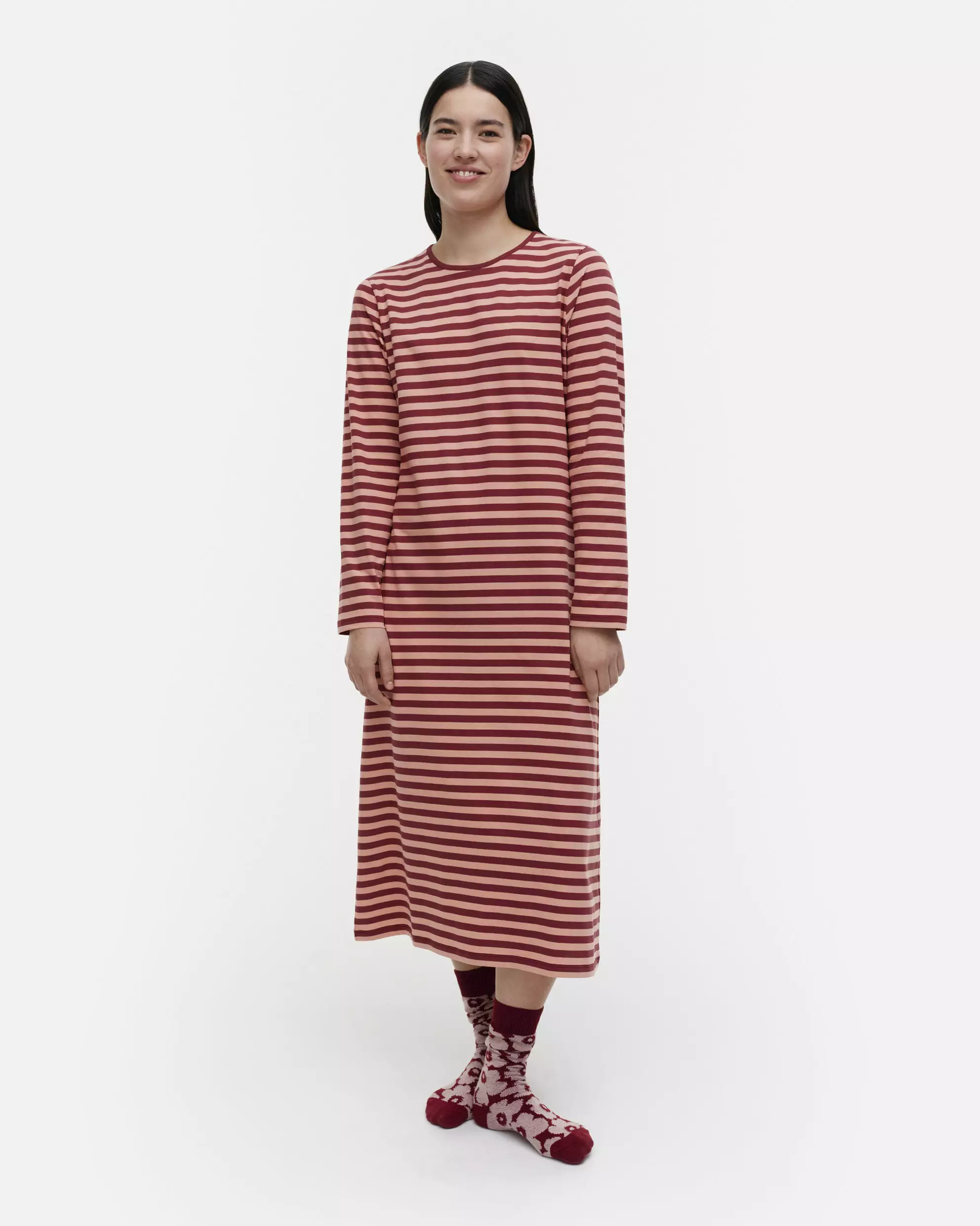 Rusko-yömekko on valmistettu luomupuuvillasta ja siinä on rento istuvuus sekä A-linjainen leikkaus. Pitkässä mekossa on Tasaraita-kuosi, resorikantti pyöreässä pääntiessä ja Marimekon painettu logo selkäpuolella.