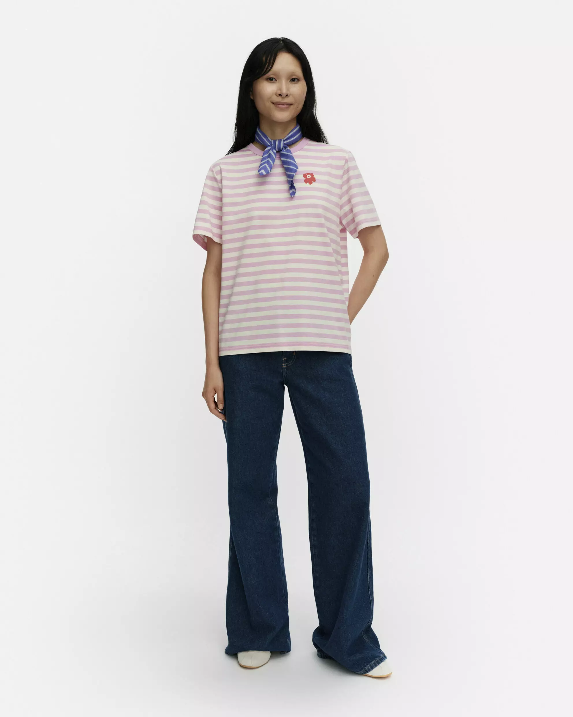 Tämä Tasaraita-t-paita on valmistettu pehmeästä ja kestävästä luomupuuvillatrikoosta, joka tuntuu iholla miellyttävältä päivästä toiseen. Paidan rento istuvuus ja pudotettu hartialinja tuovat asuun modernia väljyyttä, joka sopii täydellisesti farkkujen tai rennompien housujen pariksi. Pyöreä pääntie on viimeistelty joustavalla resorilla, joka antaa paidalle ryhdikkään ilmeen. Vasempaan rintaan sijoitettu pieni Unikko-kukka tuo perinteiseen raitapaitaan tunnistettavan ja modernin Marimekko-yksityiskohdan.