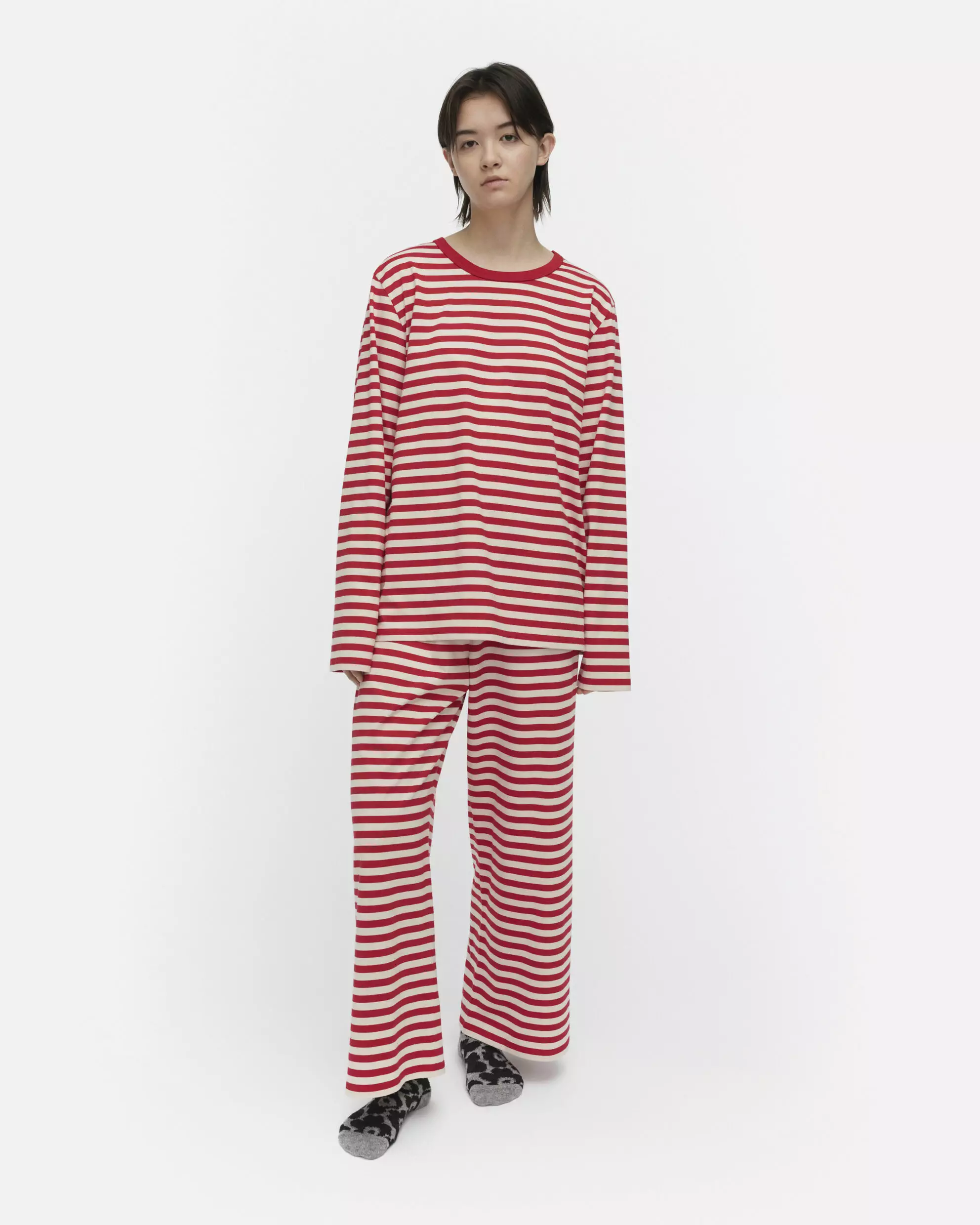Tämä Marimekon Kioski Tasaraita -trikoopaita on ajaton klassikko, joka on täydellinen lisä vaatekaappiisi. Paita on valmistettu pehmeästä luomupuuvillasta ja siinä on Annika Rimalan suunnittelema ikoninen Tasaraita-kuosi. Sen suora siluetti ja rento mitoitus tekevät siitä mukavan päällä.
