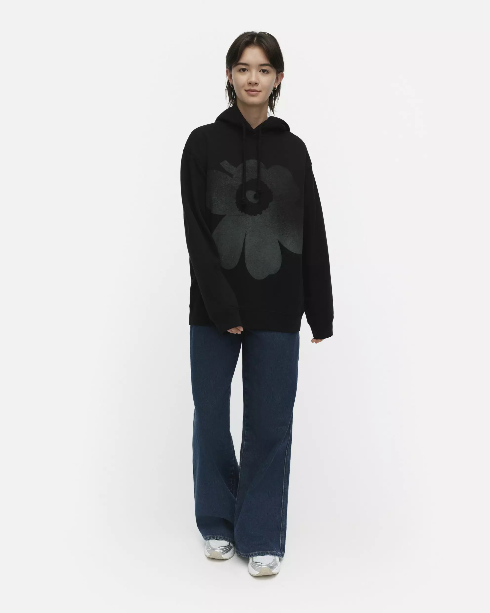 Ominaisuudet: Unisex-mitoitus, suuri Unikko-kuosi, kiristysnyörit hupussa, resorit hihansuissa ja helmassa