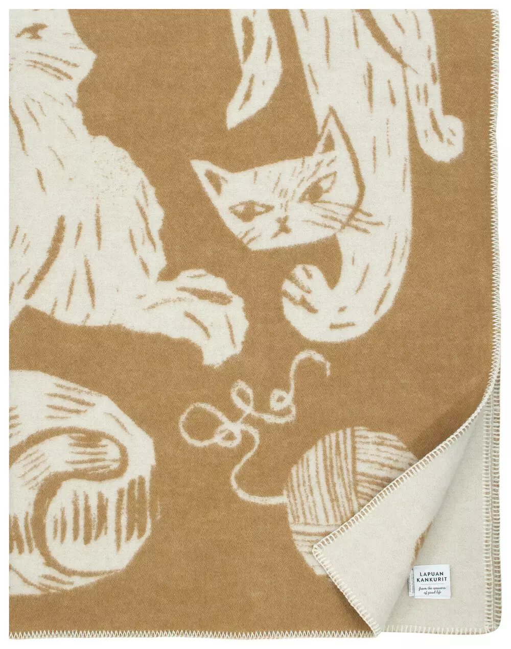 Tuote: LAPUAN KANKURIT Kissanpäivät Villahuopa 130x180 cm Avainsanat: Lapuan Kankurit, Kissanpäivät, villahuopa, torkkupeitto, Matti Pikkujämsä, konjakki, Avainlippu, 100% villa, mulesing-vapaa, suomalainen design.