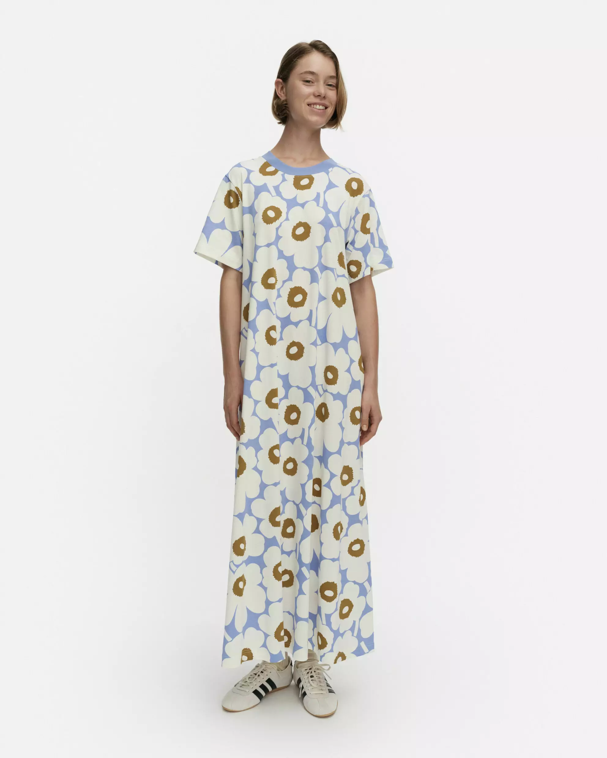 Marimekko Koostua on täydellinen yhdistelmä t-paidan rentoutta ja näyttävää maksimekkoa. Tässä A-linjaisessa trikoomekossa ikoninen Unikko-kuosi esiintyy raikkaassa valkoisen, sinisen ja ruskean sävymaailmassa (väri 158). Se on vaivaton luottovaate, joka tuo design-iloa niin kaupungille, rannalle kuin koti-iltoihinkin.