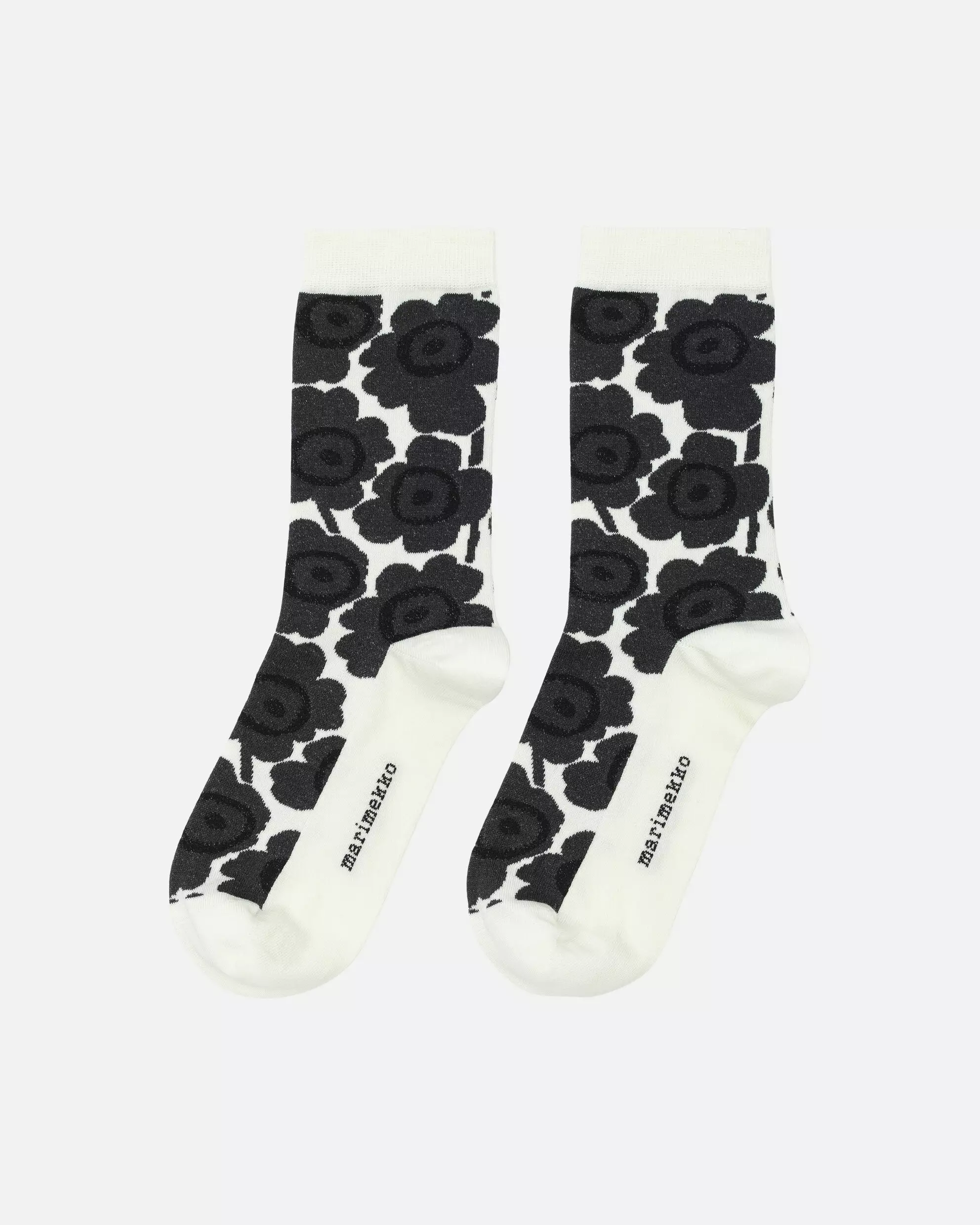 Tuote: Marimekko Linjaus Unikko Sukat Avainsanat: Marimekko Linjaus sukat, Unikko nilkkasukat, luomupuuvilla sukat, musta valkoinen, Maija Isola.