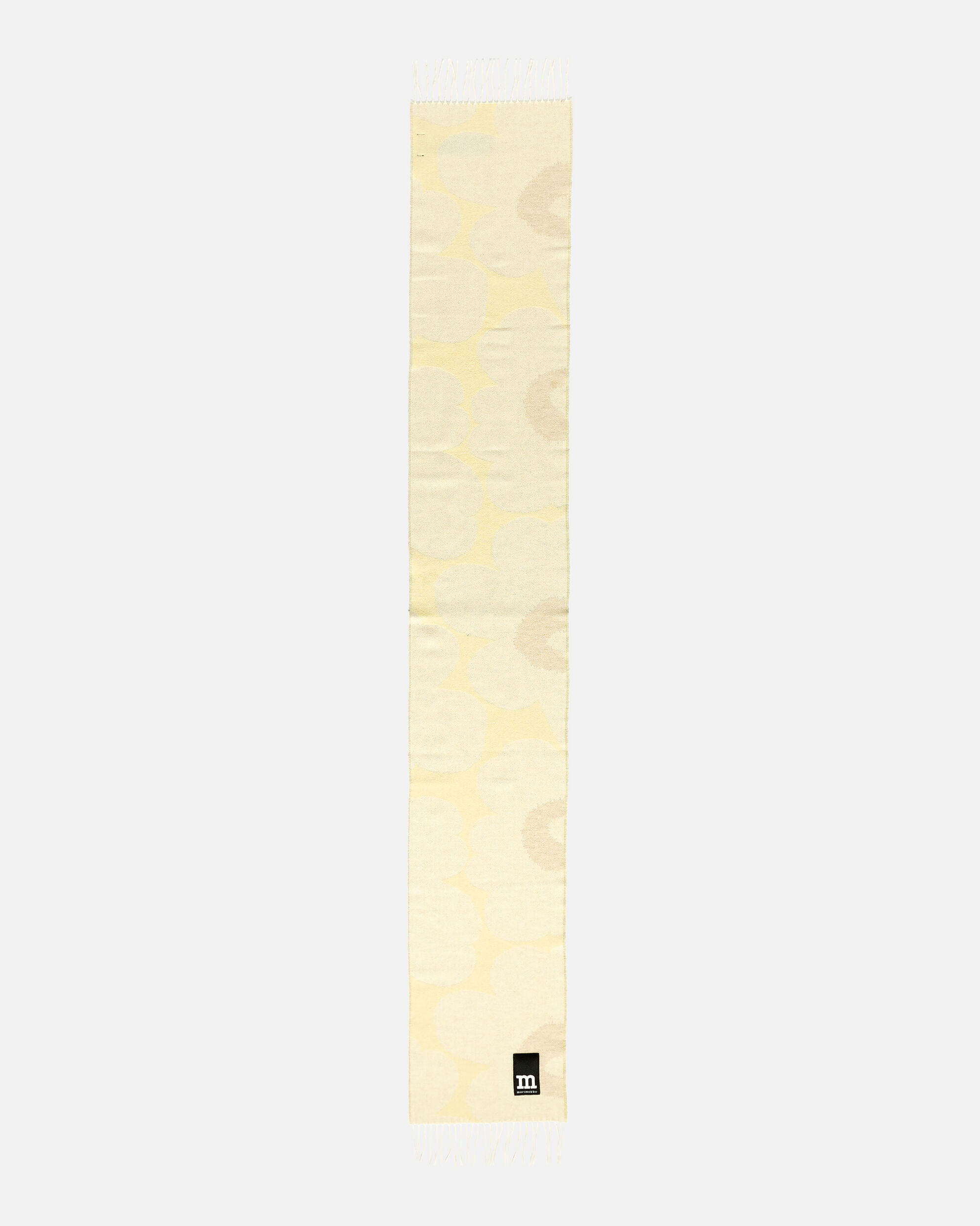Unikko-kuosinen Lohtta-huivi on valmistettu villasekoitteesta. Pitkässä huivissa on päätyhapsut.