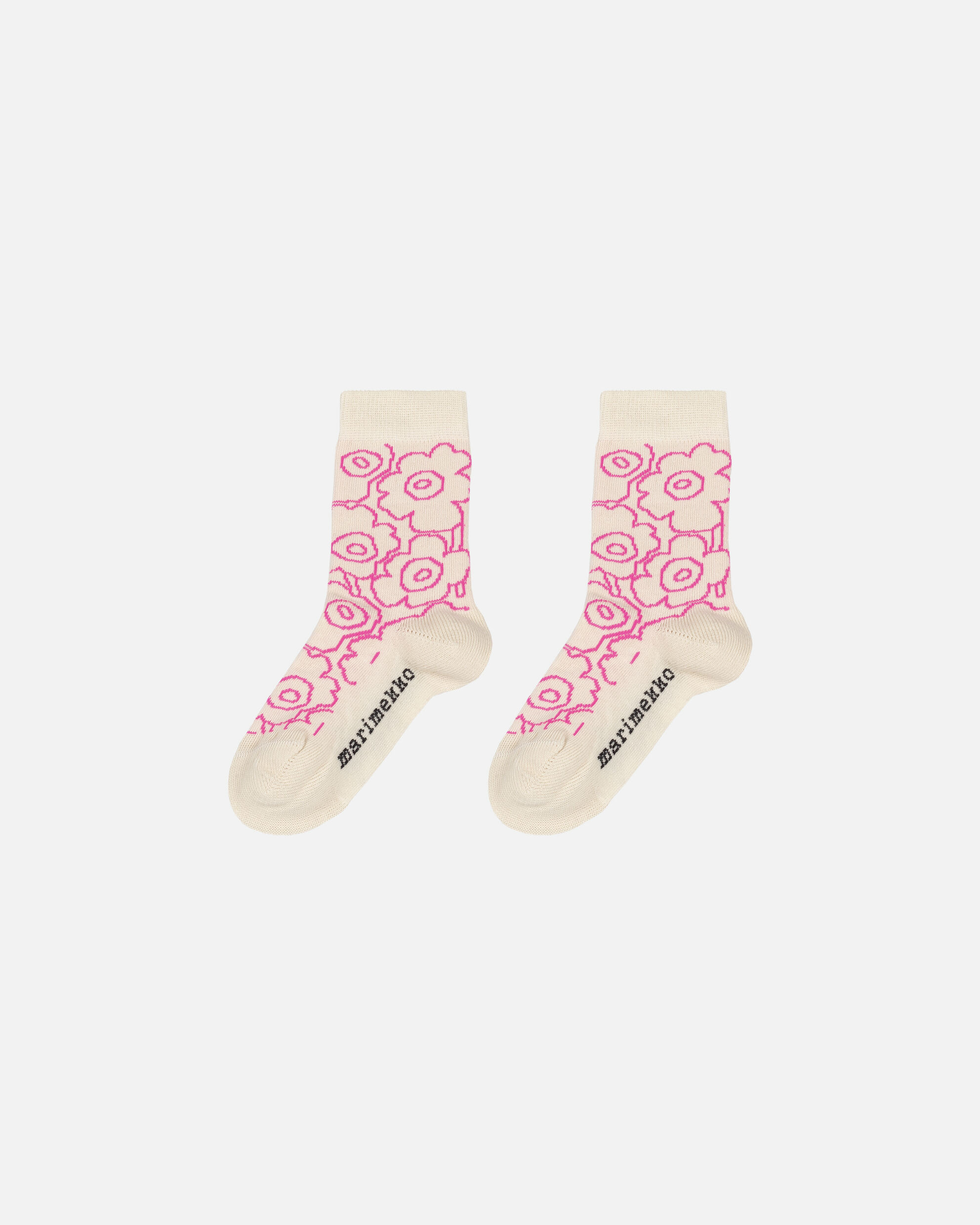 Lasten Makeinen-nilkkasukat on valmistettu puuvillaseoksesta ja niissä on Unikko-kuosi.