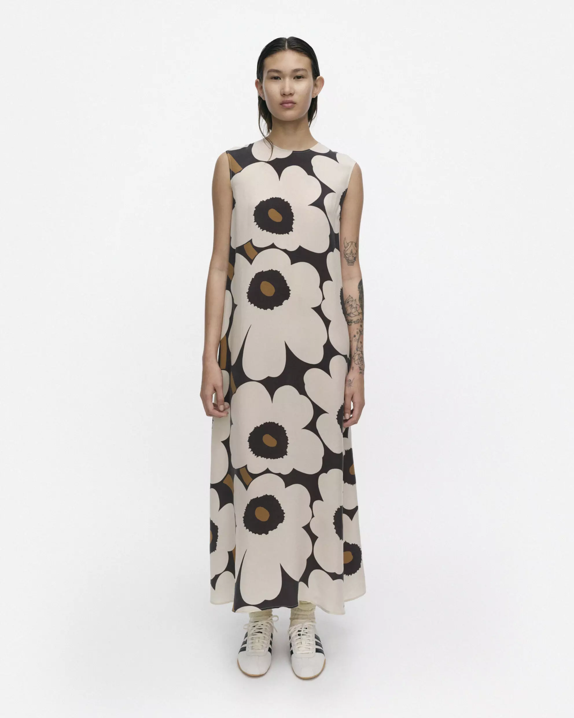 Marimekko Migot on hienostunut ja veistoksellinen A-linjainen maksimekko, jossa Maija Isolan ikoninen Unikko-kuosi esiintyy hillityn tyylikkäissä vaalean beigen, mustan ja ruskean sävyissä (väri 198). Tämä hihaton mekko yhdistää modernin materiaaliteknologian ja ajattoman designin, luoden kokonaisuuden, joka sopii täydellisesti niin juhlavampiin tilaisuuksiin kuin tyylikkääseen arkipukeutumiseen.