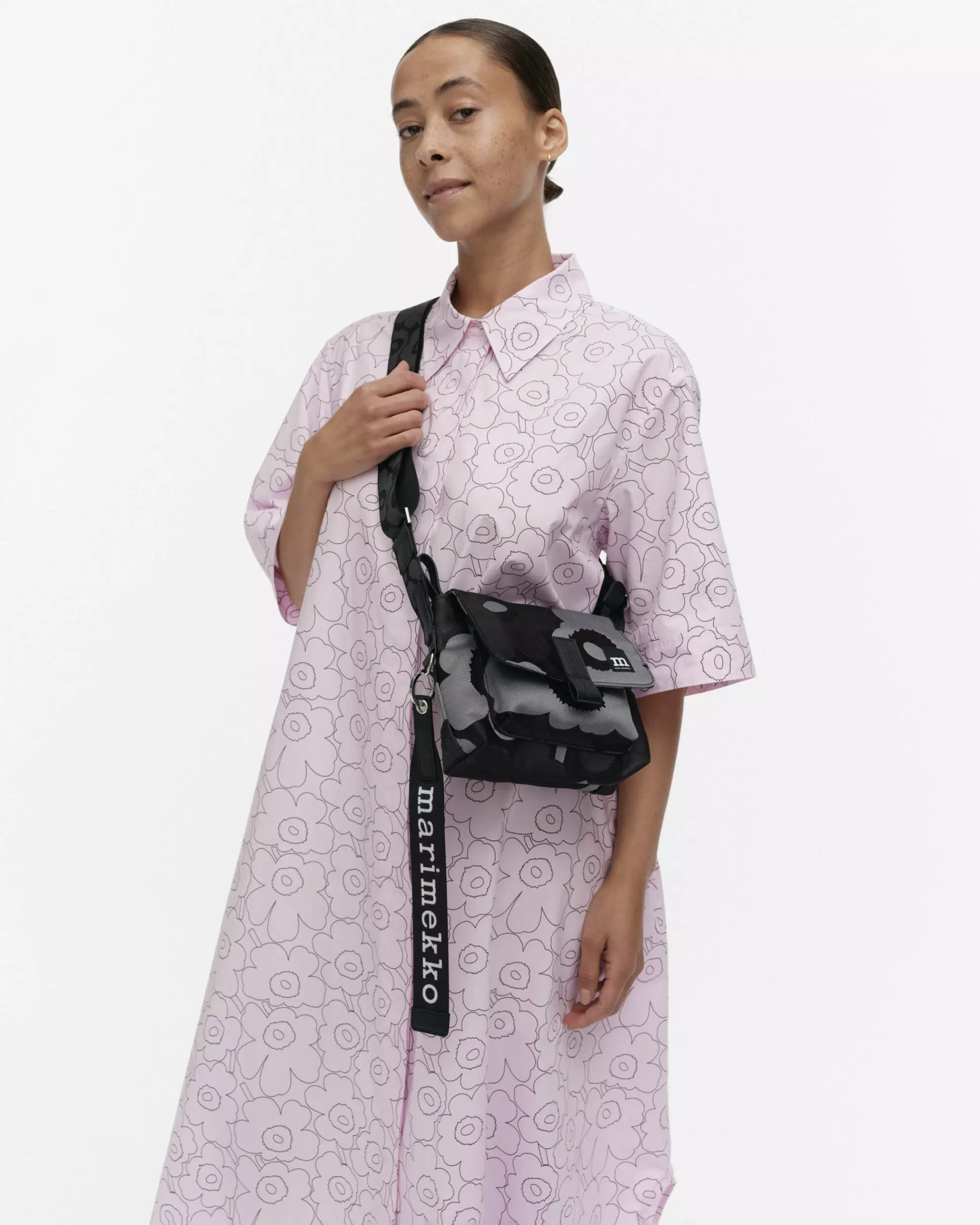 #marimekko #minimessenger #unikko #olkalaukku #pienilaukku #kierrätettypolyamidi #kierrätettynahka #jacquard #vastuullinen #ekologinen #harmaa #musta #suomalainendesign #maijaisola #kiina #kompakti #monikäyttöinen #lahjaidea #crossbody