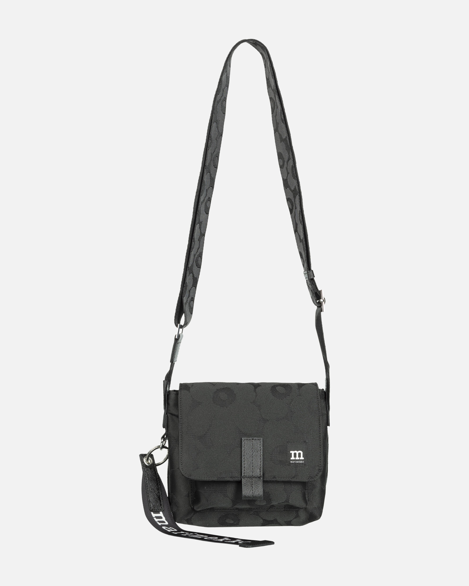 Mini Messenger -olkalaukku on valmistettu kierrätetystä polyesteristä, jossa on jacquard-kudottu Unikko-kuosi. Laukussa on kansiläppä, jonka alla on pieni avoin tasku sekä suurempi avoin osasto. Olkahihna on säädettävä ja siinä on jacquard-kudottu Unikko-kuosi. Laukkuun on kiinnitetty Marimekko-avaimenperä ja siinä on nahkaisia yksityiskohtia.