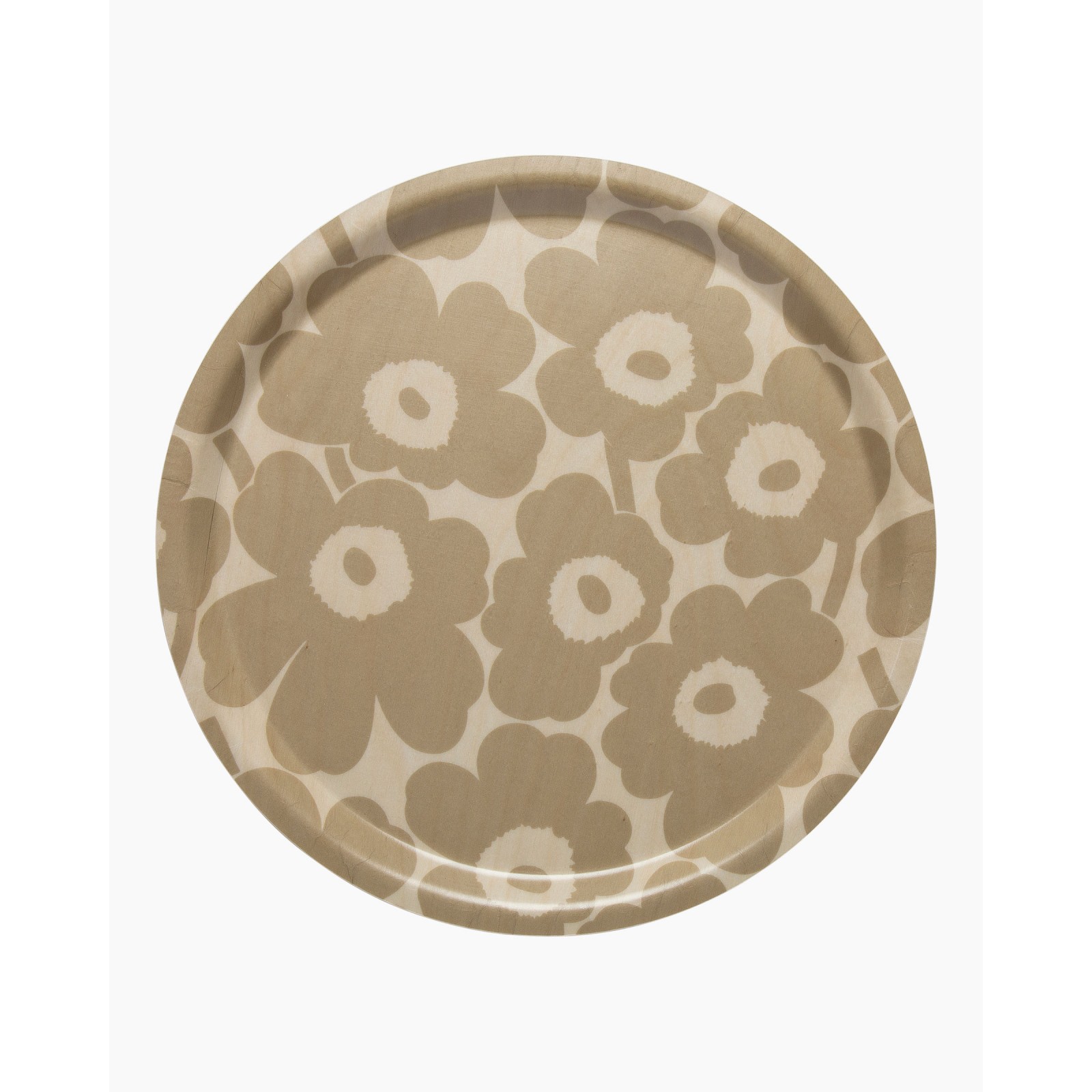 Klassikko ja ikisuosikki Mini Unikko kuosi koristaa tätä kaunista ja monikäyttöistä tarjotinta ihanassa vaaleanruskean ja beigen sävyissä. Sopii klassisen kuosin ja värien ansiosta moneen sisustukseen. Tältä tajottimelta on tyylikäs tarjoilla vieraille vaikka alkumaljat tai laittaa kauniisti tarjoiltavat juhlapöytään. Laminoitua kevyttä koivuvaneritarjotinta koristaa mustavalkoinen Räsymatto kuosi. Käytännöllinen tarjotin on halkaisijaltaan 31 cm. Loistava tuote itselle tai lahjaksi.