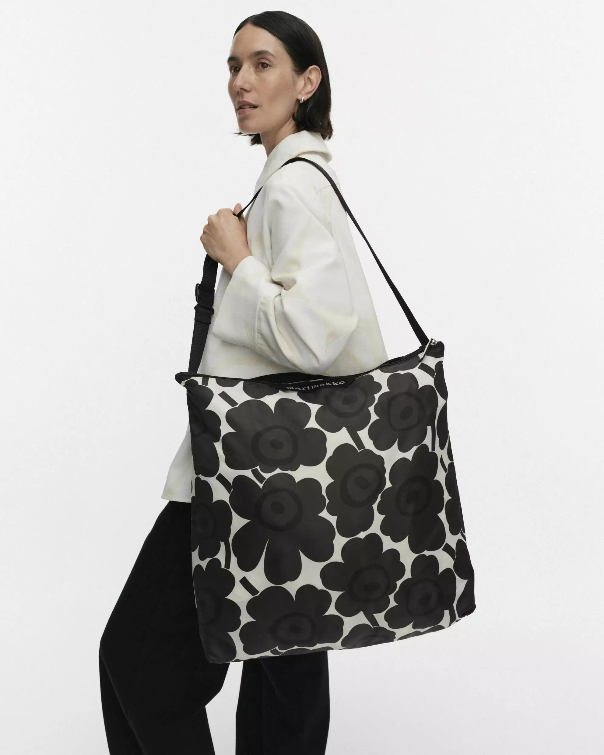 Tuote: Marimekko Neat Crossbody Unikko L Olkalaukku Avainsanat: Marimekko Neat Crossbody L, Unikko olkalaukku, kierrätyspolyesteri laukku, pakattava laukku, tummanharmaa luonnonvalkoinen, Maija Isola.