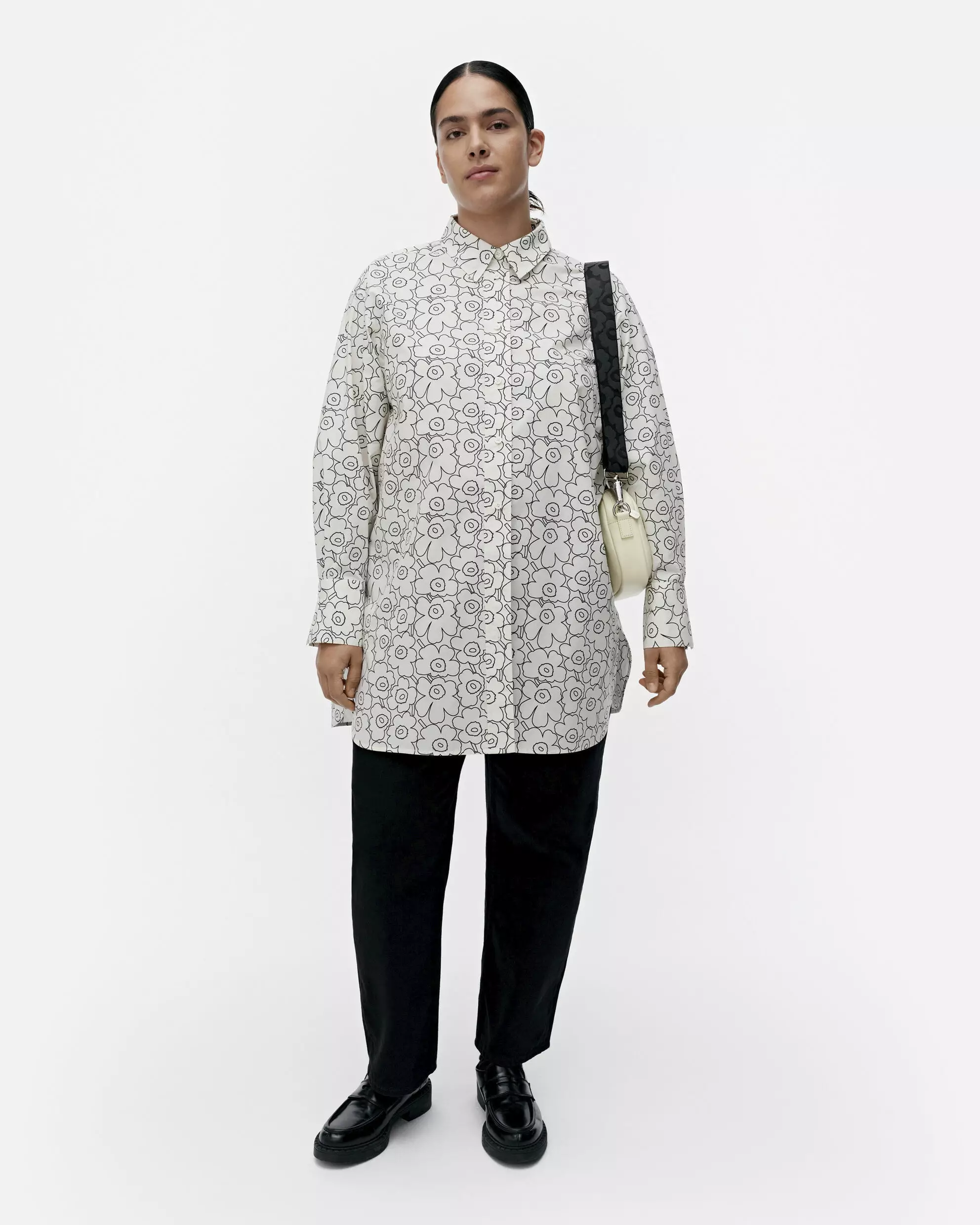 Paita on koristeltu ilmavalla Piirto Unikko -kuosilla, joka on moderni ja minimalistinen tulkinta Maija Isolan rakastetusta Unikko-kuviosta vuodelta 1964. Tämä graafinen versio korostaa kuosin selkeitä linjoja ja ajattomuutta.